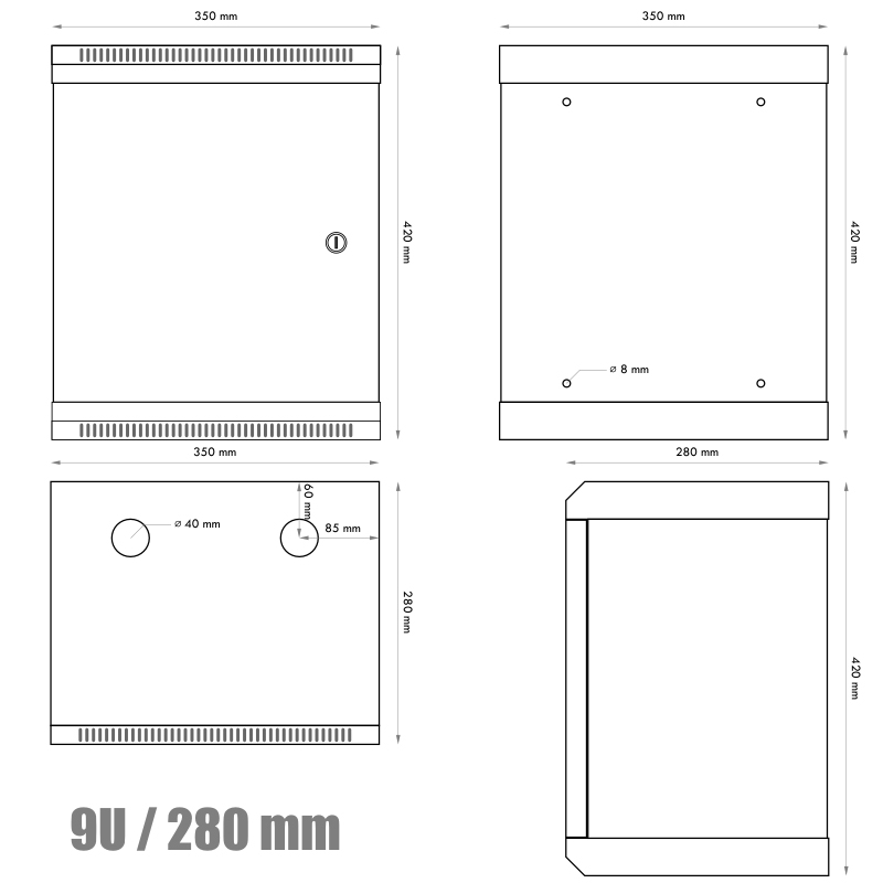 10" rack jednodílný 9U/280 DATACOM šedý plech.dv.