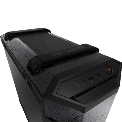 *Nepřehlédnutelný: Přední kovový panel s typickým vzorem TUF Gaming a 4 mm tlustým, kouřovým bočním panelem z tvrzeného skla, které vystaví na obdiv vnitřní výbavu vaší stavby.