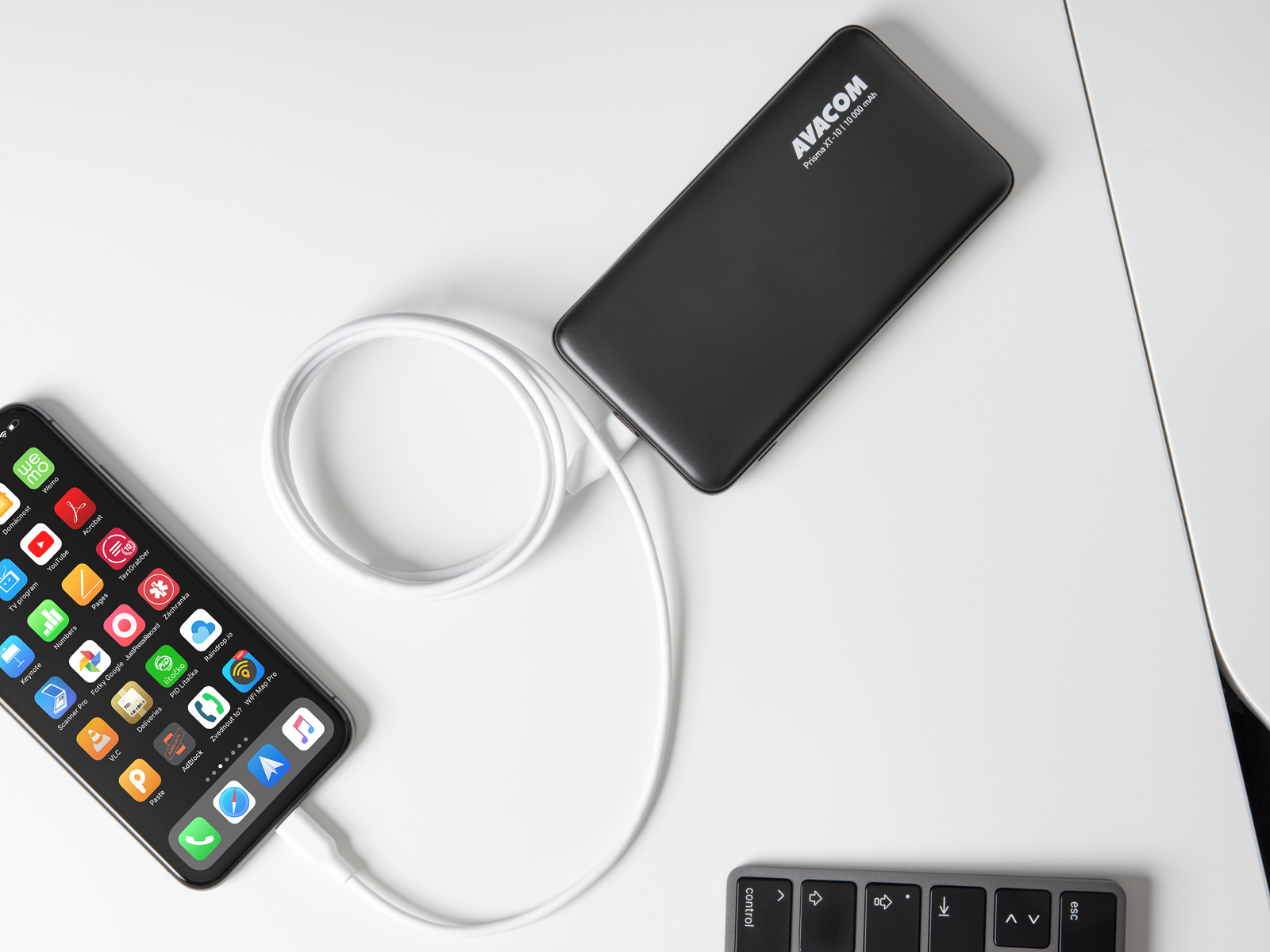 Datový a nabíjecí kabel s konektory Lightning a USB-C.