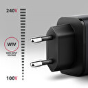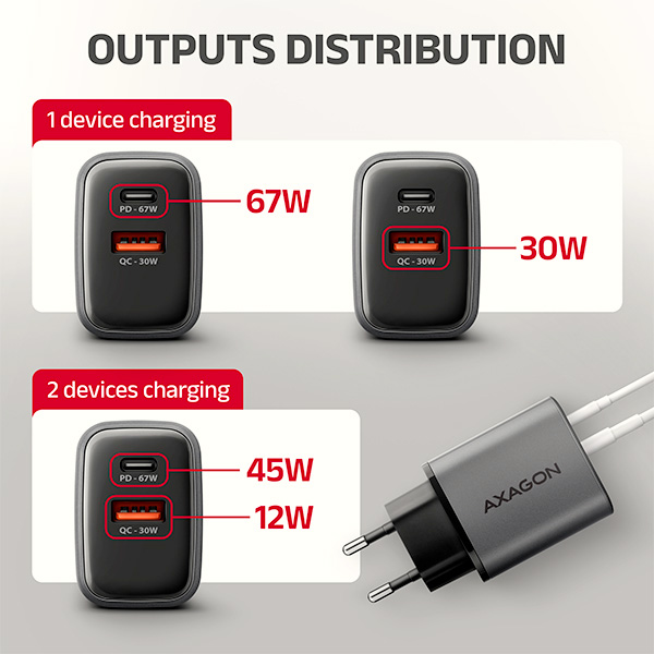 Cestovní nabíječka do sítě AXAGON ACU-PQ67D GaN umožňuje rychlé nabíjení až dvou mobilních zařízení současně. Díky celkovému výkonu 67W dokáže nabíječka dobíjet notebooky, tablety, telefony a další mobilní zařízení nejvyšší možnou rychlostí. Adaptér nabízí nejen standardní USB-A konektor, ale také oboustranný USB-C konektor. Přehledný LCD displej zobrazuje aktuální výkon nabíjení. Kompaktní velikost a vysoký výkon je daný využitím nové GaN technologie. Použité součástky s Nitridem Galia pracují s vysokou účinností, což umožňuje dosahovat vysokých výkonů při malé velikosti. Nabíječka je vybavena výstupem Power Delivery 3.0 / Quick Charge 4+ USB typu C a Quick Charge 3.0 USB typu A, díky čemuž umožňuje rychlé nabíjení nejen smartphonů a tabletů, ale i notebooků. Technologie Quick Charge 4+ umožňuje až 4x rychlejší nabíjení telefonů než běžná USB nabíječka. Technologie Power Delivery 3.0 nejenže podporuje nabíjení moderních telefonů, ale také umožňuje 67W nabíjení moderních notebooků. Apple zařízení podporují rychlé nabíjení, jehož maximální výkon se liší podle konkrétního modelu: iPhone 12-15 podporují nabíjení až 20W, iPhone 16 a 16 Pro až 24W, modely iPhone 13 Pro až 15 Pro a iPhone 17 až 27W. Vyšší výkon nabízí iPhone 16 Pro Max až 30W a iPhone 17 Pro a Pro Max až 40W. Nabíječka je kompatibilní také s iPady a notebooky Apple MacBook Air a Pro. Samsung telefony Galaxy podporují rychlé nabíjení Super Fast Charging až 25W SFC pro řady Galaxy S20-S25 a skládací modely Z Fold a Z Flip. Vybrané modely Galaxy Ultra a tablety Galaxy Tab umožňují ještě rychlejší nabíjení až 45W SFC 2.0. Podporovány jsou také ostatní značky, jako jsou Motorola, Google Pixel, Xiaomi, Honor, Oppo, OnePlus, Realme a další běžné telefony a tablety. Nabíječka je vhodná i pro nabíjení notebooků s technologií PD 3.0 až do 67W, včetně značek Lenovo, HP, Dell, Acer, Asus a dalších. Pokročilý systém ochran na výstupu nabíjecího adaptéru chrání nabíjené zařízení před poškozením. Funkce nabíječky také zajistí rozpoznání nabíjeného zařízení a zvolení optimální rychlosti a průběhu nabíjení. Tělo napájecího adaptéru má příjemný tvar a kompaktní velikost. Ve srovnání s klasickými nabíjecími adaptéry se stejnými parametry je velikost této nabíječky až o polovinu menší. Kombinace malých rozměrů, dosažených pomocí GaN technologie, a širokého rozsahu vstupního napětí, dělá z této nabíječky ideálního pomocníka na cesty. Integrovaný LCD displej přehledně zobrazuje aktuální nabíjecí výkon ve wattech v reálném čase, takže máte snadnou kontrolu nad tím, že připojené zařízení skutečně využívá například rychlé nabíjení. Vstup: • vstupní napětí AC 100V-240V / 1.8A / 50-60Hz (funkce WIV), podporuje více národních napájecích standardů • dvoukolíková euro vidlice - integrovaná v těle napáječe Výstupy: • USB-A port QC (telefony) max. 30W: 5V/3A, 9V/3A, 12V/2.5A, 15V/2A, 20V/1.5A • Technologie nabíjení: QC 3.0, QC 2.0, AFC, SCP, FCP, SMART, Apple 2.4A • USB-C port PD (notebooky, telefony) max. 67W: 5V/3A, 9V/3A, 12V/3A, 15V/3A, 20V/3.35A, PPS: 3.3-11V/5A • Technologie nabíjení: PD 3.0, PD 2.0, PPS, QC4+, QC 3.0, QC 2.0, SFC 2.0, SFC, AFC, SCP, FCP, SMART, Apple PD Maximální výkon nabíječky s použitím více portů: 2 zařízení připojená současně • USB-C port PD = 45W MAX • USB-A port QC = 12W MAX Pozn.: Při současném nabíjení více zařízení si jednotlivá zařízení automaticky rozdělují potřebný výkon. Přidělený výkon se může v průběhu nabíjení měnit. Podporované technologie nabíjení: • Standardní nabíjení všech zařízení s podporou 5V a nabíjení Apple iPhone 5, 6, SE, 7. • SMART - nabíjení max. 5V/4.5A, Quick Charge 1.0, USB Battery Charging 1.2 (DCP 1.5A) a Apple 2.4A (iPad). • FCP - rychlé nabíjení pomocí protokolu Huawei Fast Charge Protocol. • SCP - rychlé nabíjení (až 25W) pomocí protokolu Huawei SuperCharge Protocol. • AFC - rychlé nabíjení pomocí protokolu Samsung Adaptive Fast Charging. • SFC - rychlé nabíjení pomocí protokolu Samsung Super Fast Charging a Super Fast Charging 2.0. • QC - rychlé nabíjení pomocí protokolu Qualcomm Quick Charge 2.0, Quick Charge 3.0 a Quick Charge 4+. • PPS - rychlé nabíjení pomocí protokolu Programmable Power Supply (součást USB PD 3.0 a QC4+). • PD - rychlé nabíjení pomocí protokolu USB Power Delivery 2.0 a Power Delivery 3.0. Příklady podporovaných telefonů, tabletů a notebooků: • SFC - rychlé nabíjení (až 25W) telefonu Samsung Galaxy S20, S21, S22, S23, S24, S25 series, Note 10, 20 series, Z Fold 2, 3, 4, 5, 6, 7 series, Z Flip 3, 4, 5, 6, 7. • SFC 2.0 - rychlé nabíjení (až 45W) telefonu Samsung Galaxy S20, S21, S22, S23, S24, S25 Ultra, Tab S7+, Tab S8+, Tab S9+, Tab S10+, Tab S8 Ultra, Tab S9 Ultra, Tab S10 Ultra • PD - rychlé nabíjení telefonů Apple iPhone 8, 8 Plus, X, XS, XS Max, XR, 11, 11 Pro, 11 Pro Max. • PD - rychlé nabíjení (až 20W) telefonu Apple iPhone 12, 12 Mini, 12 Pro, 12 Pro Max, 12, 12 Mini, 12 Pro, 12 Pro Max, 13, 13 Mini, 14, 14 Plus, 15, 15 Plus, 16 Plus • PD - rychlé nabíjení (až 24W) iPhone 16e, iPhone 16, iPhone 16 Pro • PD - rychlé nabíjení (až 27W) telefonu Apple iPhone 13 Pro, 13 Pro Max, 14 Pro, 14 Pro Max, 15 Pro, 15 Pro Max, iPhone 17 • PD - rychlé nabíjení (až 30W) iPhone 16 Pro Max • PD - rychlé nabíjení (až 40W) iPhone 17 Pro, 17 Pro Max • PD - rychlé nabíjení (až 67W) notebooků Lenovo, HP, Dell, Acer, Asus, Apple MacBook Air, MacBook Pro, iPad mini, iPad Air, iPad Pro a dalších. Nabíječka podporuje funkce WIV, AIC, CC: • Wide Input Voltage - funkce širokého rozsahu vstupní