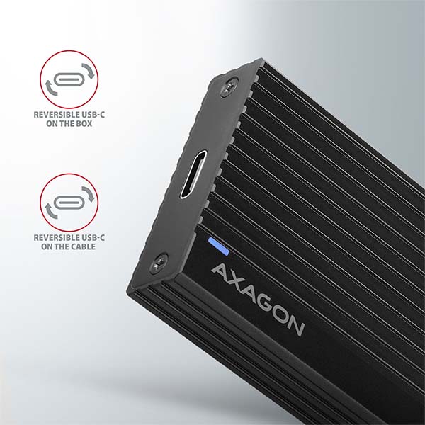 Super rychlý externí AXAGON EEM2-GTR THIN RIB box s USB 3.2 Gen 2 rozhraním je určen pro NVMe (PCI-Express) M.2 SSD disky. Spolehlivé připojení k počítači umožňuje oboustranný USB-C konektor na boxu spolu s dodávaným kabelem USB-C -> USB-C.