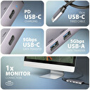 Další z USB-C (PD) konektorů je vyhrazen pouze pro nabíjení telefonů nebo notebooků pomocí technologie Power Delivery 3.0 výkonem až 100W. Do hubu zapojíte vhodnou USB-C Power Delivery nabíječku a hub připojíte k notebooku s podporou Power Delivery. Tím také uvolníte jeden USB-C port.