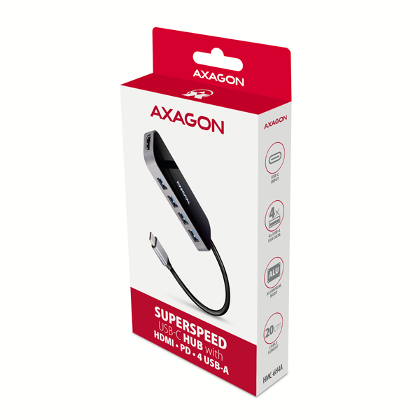 AXAGON HMC-6H4A, USB 3.2 Gen 1 hub, porty 4x USB-A, HDMI 4k/30Hz, PD 100W, kabel USB-C 20cm