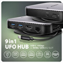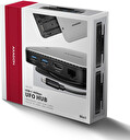AXAGON HMC-UFO USB-C 10Gbps UFO hub rozšíří Váš notebook, počítač nebo tablet o osm portů a externí box pro M.2 disk. Váš notebook připojíte k dokovací stanici 9in1 přes USB-C 65 cm dlouhý kabel. V okamžiku tak máte k dispozici integrovaný slot pro NVMe nebo SATA M.2 disk, čtečku SD i microSD karet a konektory pro připojení monitoru, USB zařízení, sluchátek, síťového kabelu a Power Delivery napájení. Kompatibilita s Thunderbolt 3/4 vám také poskytne jednoduchou a skladnou dokovací stanici k notebooku jako je například Apple MacBook Air nebo Pro.