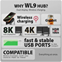 Multiportový USB-C 10Gbps AXAGON HMC-WL9 WIRELESS CHARGING 9in1 hub rozšíří váš notebook, počítač nebo telefon o dva video výstupy, LAN konektor, USB porty a bezdrátovou nabíječku. Váš notebook připojíte k hubu přes 60 cm dlouhý USB-C kabel. Okamžitě tak máte k dispozici připojení pro dva 4K monitory, čtyři USB zařízení a konektor RJ-45 pro Gigabitovou Ethernet síť. Zároveň získáte možnost napájení notebooku pomocí technologie Power Delivery. Díky kompatibilitě s rozhraním Thunderbolt 3/4/5 můžete dokovací stanici 9v1 použít i s notebooky, jako jsou například Apple MacBook Air nebo MacBook Pro.