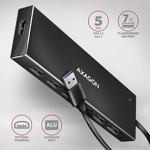 Tenký USB 3.2 Gen 1 (USB 3.0) hub AXAGON HUE-F7A s USB kabelem dlouhým 1.2m snadno a rychle připojí k počítači až sedm USB zařízení současně. Standard USB 3.2 Gen 1 umožní přenosovou rychlost až 5Gb/s.
