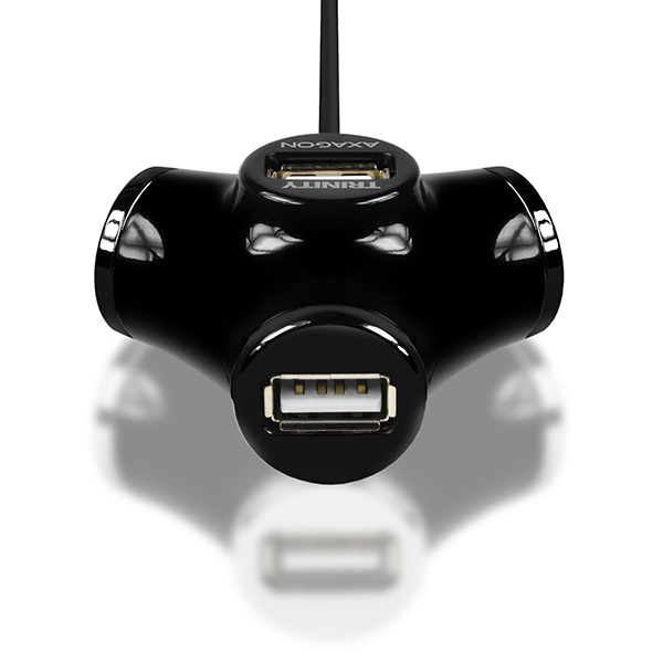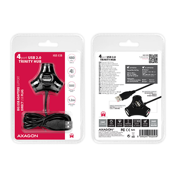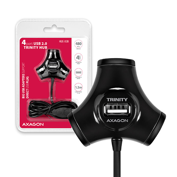 Čtyřportový USB 2.0 hub AXAGON HUE-X3B TRINITY se vyznačuje velmi praktickým designem spojujícím vysokou funkčnost i líbivý moderní vzhled. Rozmístění USB portů po obvodu hubu umožňuje bezproblémové připojení jakéhokoliv USB zařízení s velkým objemem hmoty kolem konektoru. Jeden USB port umístěný shora je zase vhodný pro připojení bezdrátového bluetooth nebo wifi adaptéru pro lepší příjem signálu a navíc stačí jen jedna ruka pro rychlé připojení například flash disku. V hubu napevno uchycený USB kabel s dostatečnou délkou 120 cm dovoluje pohodlně přivést USB porty na pracovní stůl z počítače umístěného pod stolem. Velmi kompaktní a velmi lehké tělo rozbočovače je však díky chytré kontrukci zároveň i velmi pevné a odolné a spolehlivě tak poslouží nejen doma ale i na cestách. Vlastnosti: • 4x downstream USB 2.0 port, 1x upstream USB 2.0 port s konektorem typu A male uchycen na 120 cm dlouhém kabelu. • Plně kompatibilní s USB 2.0 a zpětně kompatibilní s USB 1.1. • Podpora přenosových rychlostí 1.5 / 12 / 480 Mb/s (low / full / high speed). • Plná podpora Plug and Play a Hot Plug. • Umožňuje propojení až 127 USB zařízení kaskádováním. • Napájení přes USB sběrnici - bus-power mód (5V - 500mA). • Detekce a ochrana proti proudovému přetížení. Další údaje: • Rozměry 56 x 50 x 30 mm. • Hmotnost 50 g (vč. USB kabelu). Podporované operační systémy: MS Windows XP / Vista / 7 / 8 / 8.1 / 10 a novější, Windows Server 2003 / 2008 / 2012 / 2016 a novější (podporovány všechny 32- i 64-bitové verze OS Windows), Mac OS X 10.x a vyšší, Linux s jádrem 2.4.x a vyšším. Pozn.: Ovladače jsou součástí podporovaných operačních systémů a nainstalují se zcela automaticky. Žádné jiné ovladače není třeba instalovat a nejsou ani k dispozici. Balení v oboustranném zataveném blistru s přehledně uvedenými parametry a postupem instalace obsahuje: • USB 2.0 rozbočovač s kabelem napevno délky 120 cm.