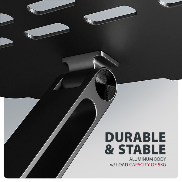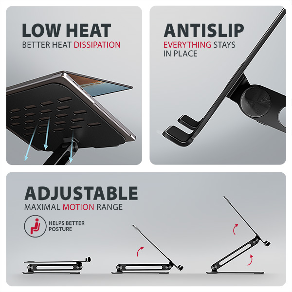 AXAGON STND-LQB je stojan s dvěma klouby na notebook či tablet, který zajišťuje pohodlí a zlepšuje ergonomii při práci. Tento stojan je ideální pro zařízení od 10" do 17.3". Kloubový mechanismus umožňuje nastavit libovolnou kombinaci výšky a úhlu. Snadno tak najdete ideální sklon stojanu pro maximální uvolnění vašich krčních a zádových svalů. Užijte si komfortní pracovní prostředí s kompaktním a přenosným stojanem, který se dokonale přizpůsobí vašim potřebám, ať už pracujete doma, v kanceláři, nebo na cestách. Podstavec je vyroben z robustních hliníkových odlitků garantujících dlouhou životnost a spolehlivost. Díky protiskluzové úpravě se nemusíte obávat nežádoucích pohybů – vaše zařízení zůstane pevně na svém místě, a to bez poškození povrchu notebooku či podložky. Tyto pečlivě navržené vlastnosti zaručují perfektní stabilitu pro váš notebook, tablet nebo dokonce oblíbenou knihu, což vám poskytne klid a pohodlí při každodenním používání. Velkou výhodou je chytré řešení s dvojitým kloubem, které umožňuje plynulé nastavení výšky obrazovky notebooku tak, aby byl v jedné rovině s vaším externím monitorem. Tím získáte další pracovní plochu ve správné úrovni očí, což výrazně zlepšuje ergonomii a pohodlí při práci, a zároveň zvyšuje vaši produktivitu. Stojan lze snadno složit do kompaktních rozměrů, což umožňuje pohodlné přenášení kamkoli potřebujete. Jeho elegantní design v černé barvě nejen stylově doplní váš pracovní stůl, ale také přináší praktické funkce, které oceníte při každodenním používání. Výřezy v podstavci zajišťují optimální odvod tepla z vašeho notebooku, čímž zvyšují jeho výkon a životnost. Díky promyšlené konstrukci můžete snadno upravit úhel náklonu, a to i s právě používaným zařízením, pro maximální pohodlí a efektivitu při práci. Vlastnosti: • Lehká a pevná kovová konstrukce. • Protiskluzová úprava, která zároveň chrání zařízení od poškrábání. • Vhodný pro 10"–17.3" notebooky, nebo jiná zařízení. • Nastavitelná výška až 205 mm. • Mnoho nastavitelných poloh. • Nastavení sklonu plochy pro notebook (0–180°). • Nastavení sklonu ramene (0–180°). • Nosnost dimenzována pro všechny typy notebooků, max. 5 kg. • Skladný a lehce složitelný. • Držák notebooku umožňuje lepší odvod tepla. • Rozměry: 280 × 255 × 54 mm (Š × H × V). • Hmotnost: 1065 g. Balení v kartonové krabičce obsahuje: • Stojan na notebook/tablet, • černá verze provedení.