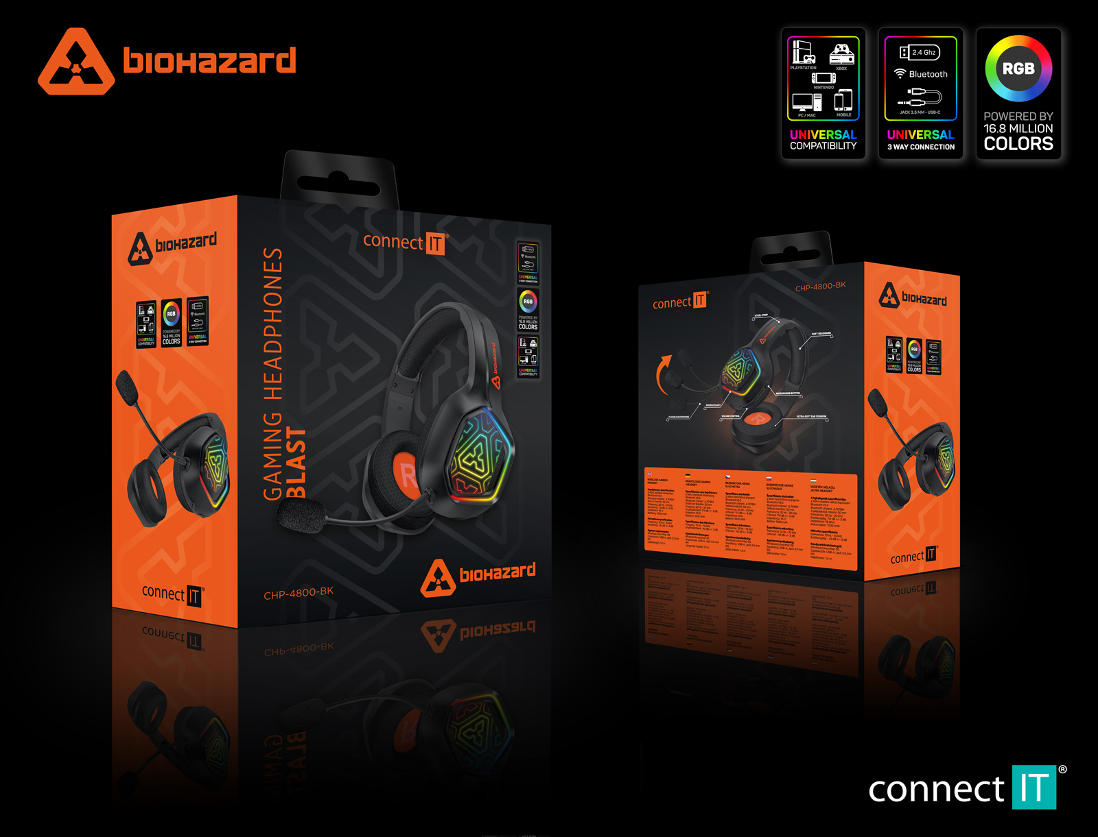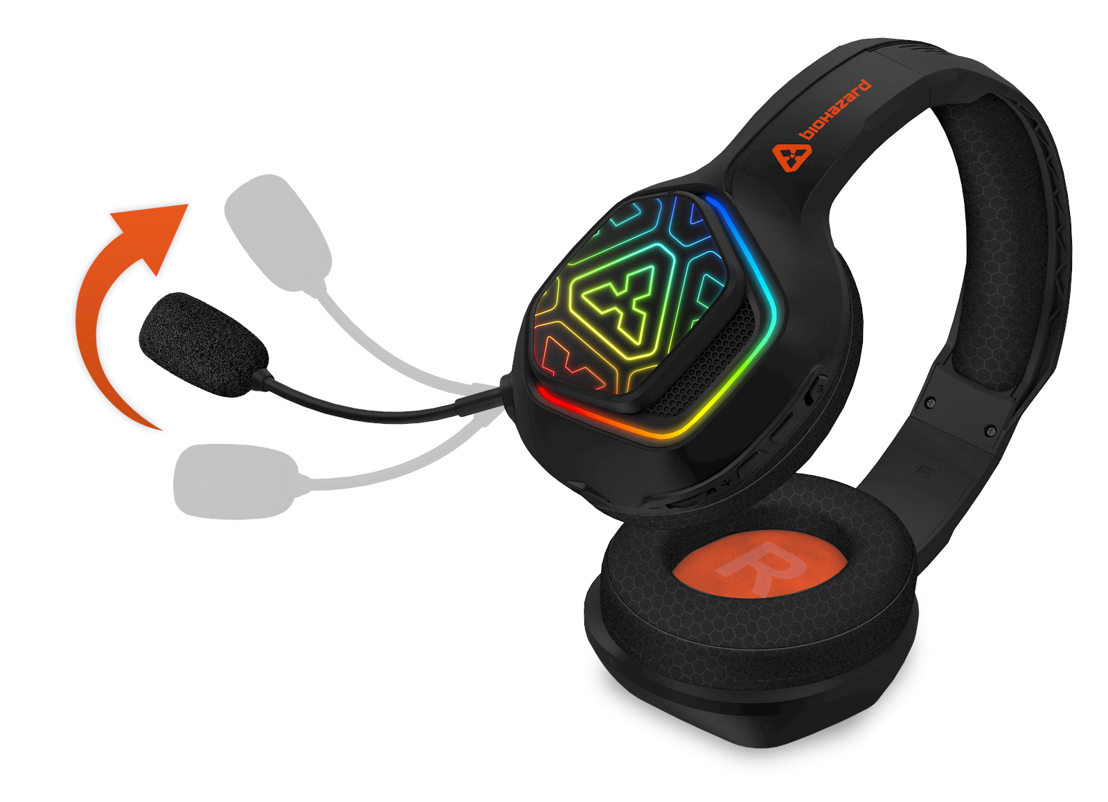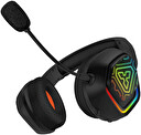 Profesionální herní bezdrátová sluchátka s připojením 2.4GHz a BT "Biohazard Wireless" s odnímatelným mikrofonem a RGB Rainbow podsvícením pro hráče počítačových her.