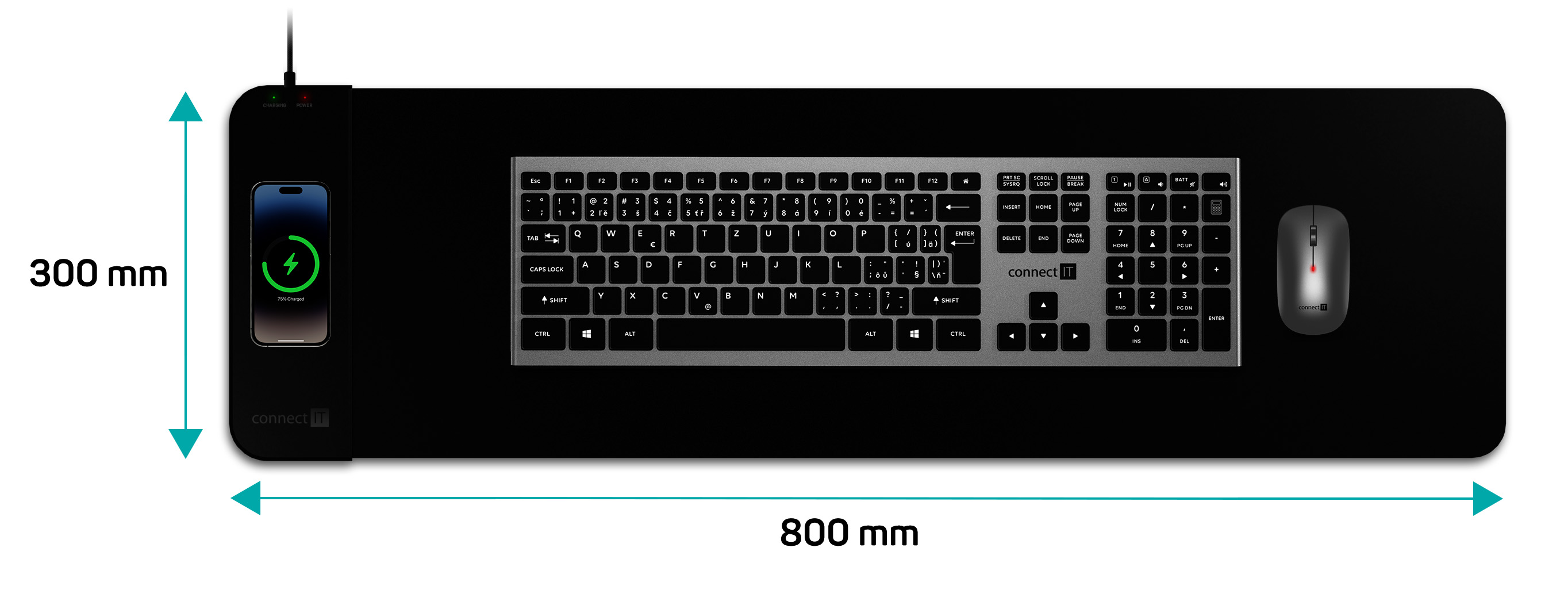 Praktická podložka pod klávesnici a myš s Qi bezdrátovým nabíjením CHARGE určená pro všestranné použití doma i v kanceláři. Podložka disponuje měkkým a příjemným povrchem a díky její velikosti plochy 800 × 300 mm vám nikdy nedojde prostor k pohybu. V levé části podložky je bezdrátová Qi nabíjecí plocha, díky které si můžete nabíjet telefon při hraní či práci.