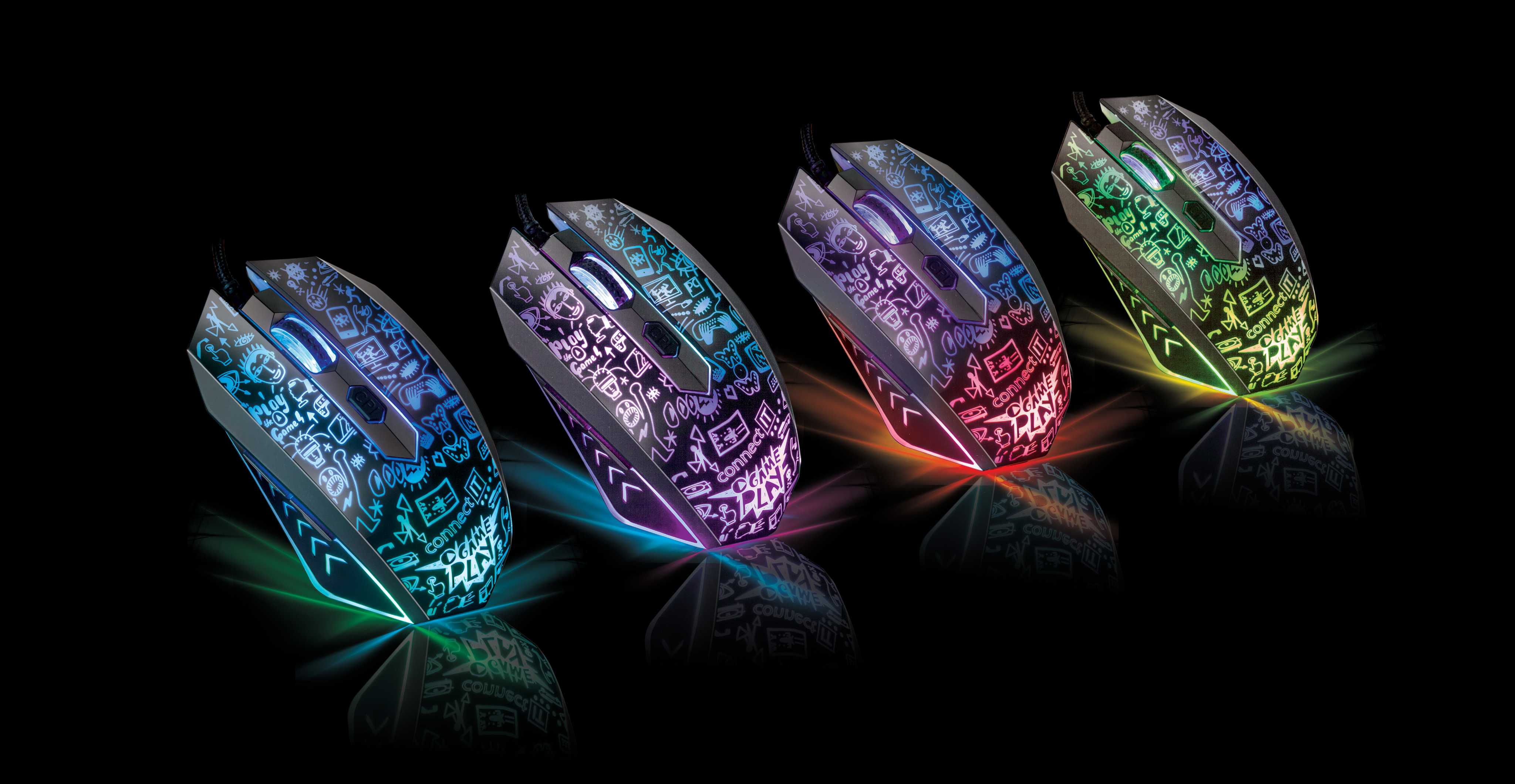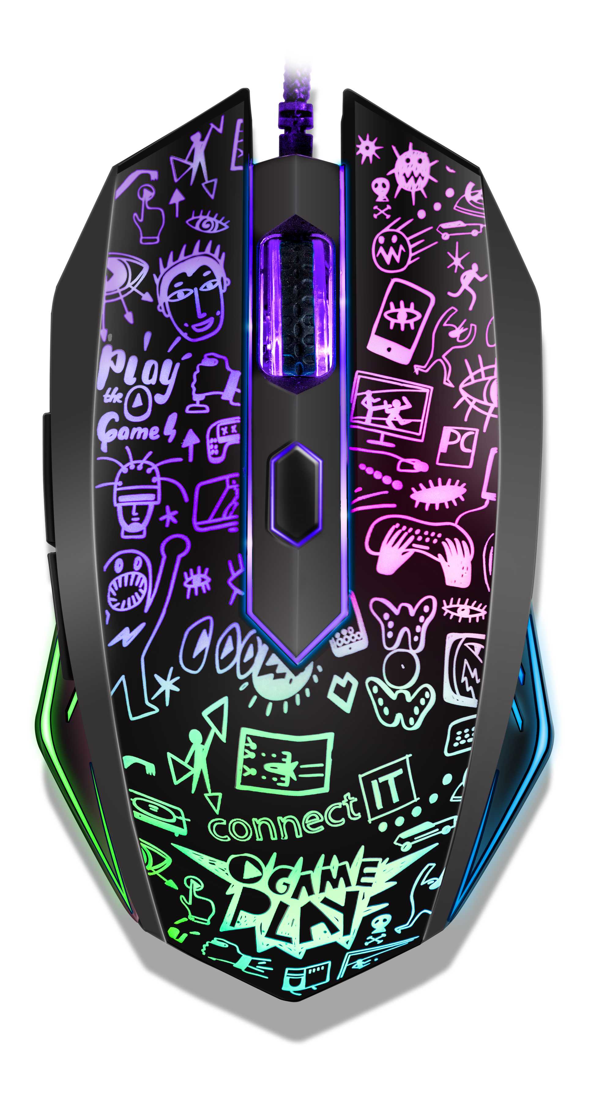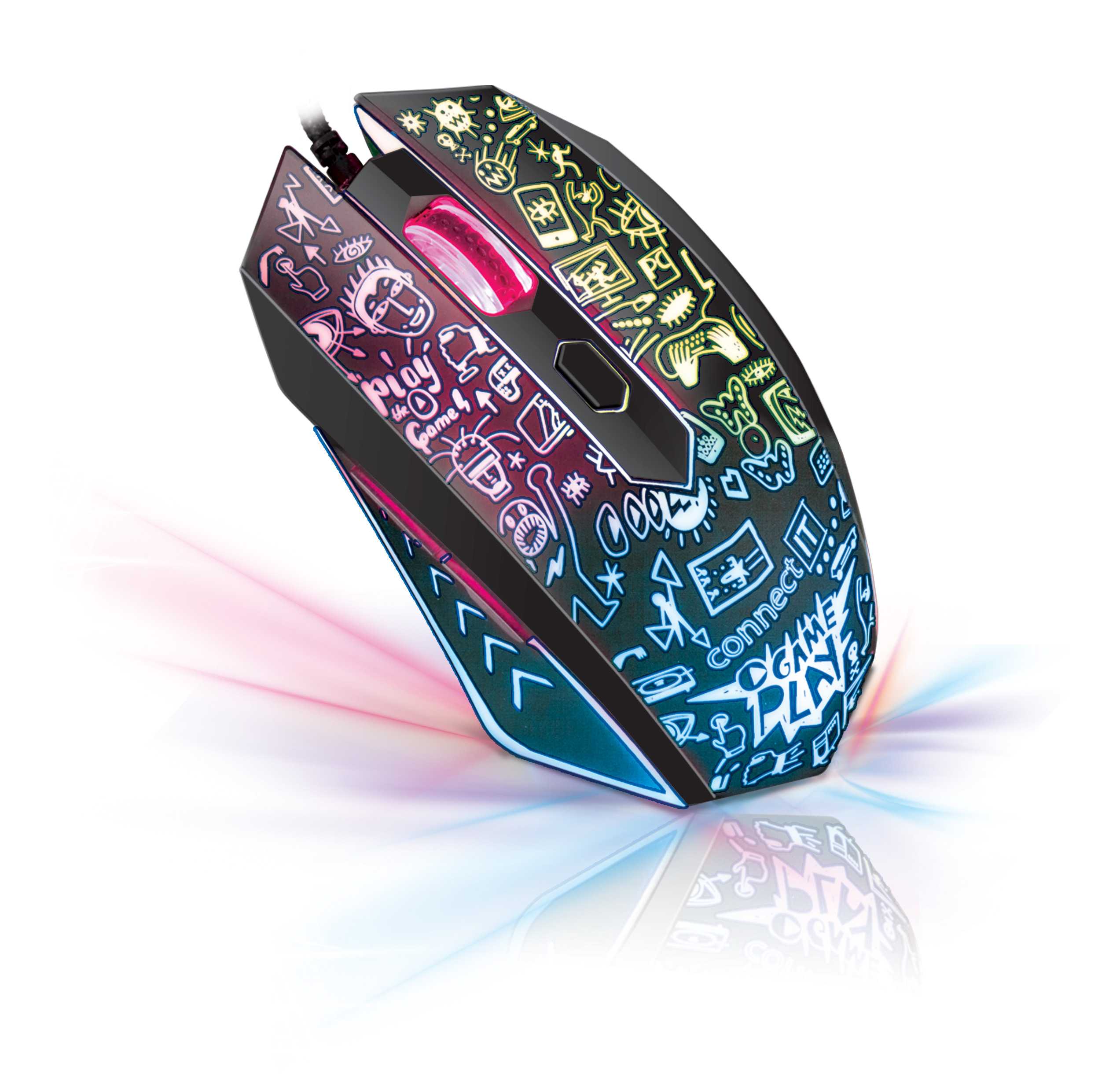 Tato pohodlná myš s výjímečným designem padne pohodlně do každé ruky a díky speciálnímu povrchu soft touch se Vám ruka snadno nespotí a vy si tak můžete užít hraní dle libosti. Vaši dlaň jistě potěší propracovaný ergonomický tvar, který ještě více umocňuje zážitek ze samotného používání. Naprostou samozřejmostí je i rychlé a přesné snímání pohybu a celkově 6 tlačítek včetně posuvného kolečka či nastavení až na 2000 DPI. Myš je po celém těle poseta drobnými obrázky, přes které prosvítá efektní vícebarevné LED podsvícení, které se plynule mění. To myši dodává naprosto unikátní vzhled.