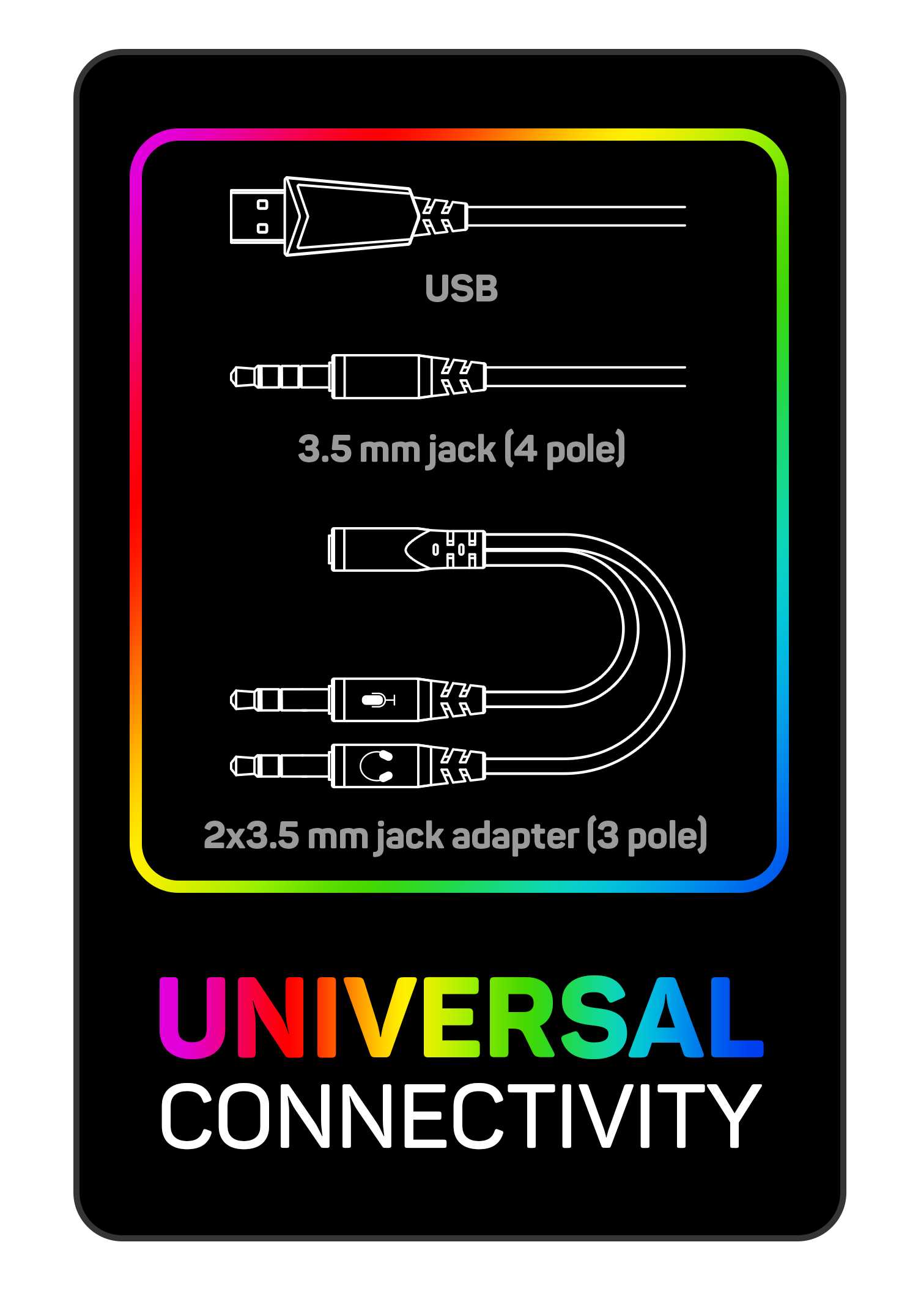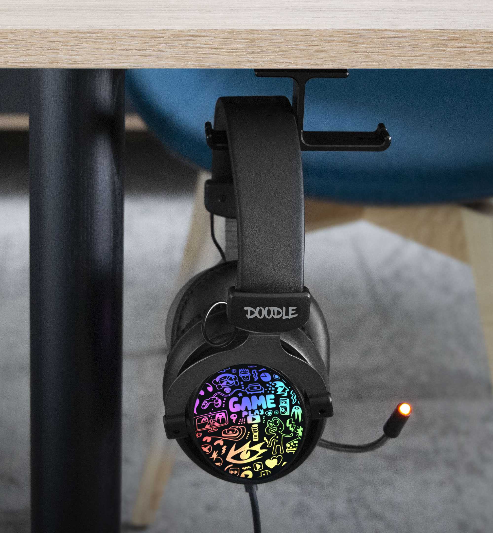 Dominantou tohoto modelu je stylizované RGB podsvícení a velké 50 mm měniče pro hluboké basy. Nechybí ani flexibilní mikrofon a regulace hlasitosti s možností vypnutí mikrofonu přímo na mušli. Samozřejmostí je pozlacený USB konektor. V balení najdete i arch promo samolepek herní řady DOODLE.