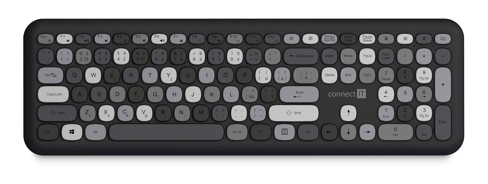 Bezdrátová klávesnice a optická myš s klávesami v šedo-černých odstínech je ideální kombinace počítačového příslušenství, které si můžete vzít s sebou domů či do práce.