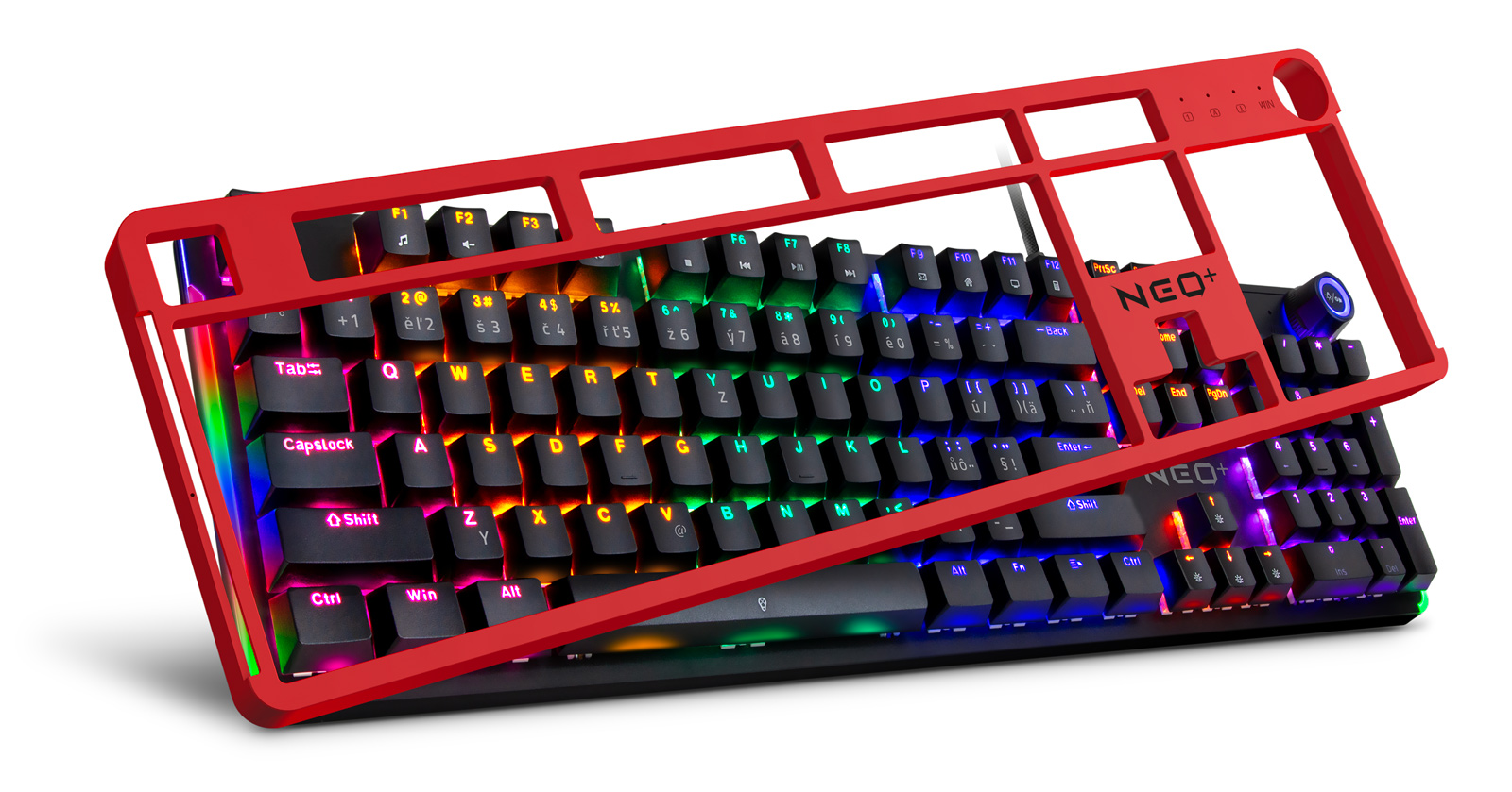 Profesionální mechanická klávesnice NEO2 + series pro hráče počítačových her v českém a slovenském layoutu s devíti módy barevného Rainbow podsvícení. K dispozici je 12 multimediálních kláves a otočné kolečko pro nastavení hlasitosti a dalších funkcí.