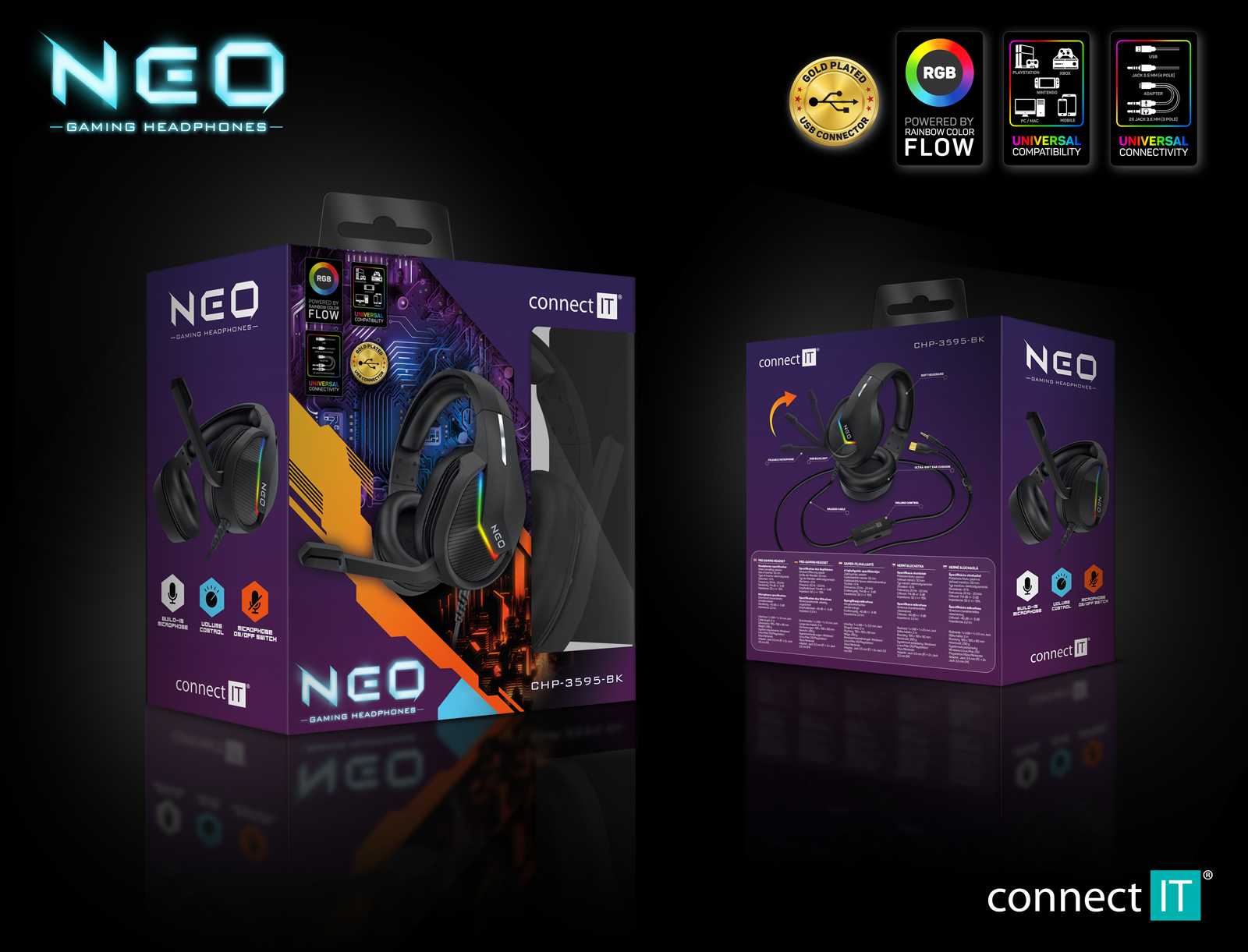 Sluchátka jsou vybavena RGB Rainbow podsvícením, ovládáním hlasitosti, sklápěcím mikrofonem a oblíbenými pozlacenými konektory. V balení najdete i 3.5 mm jack adaptér pro maximální kompatibilitu a arch promo samolepek herní řady NEO.