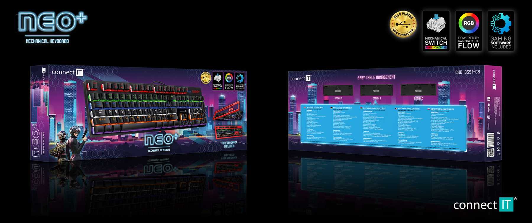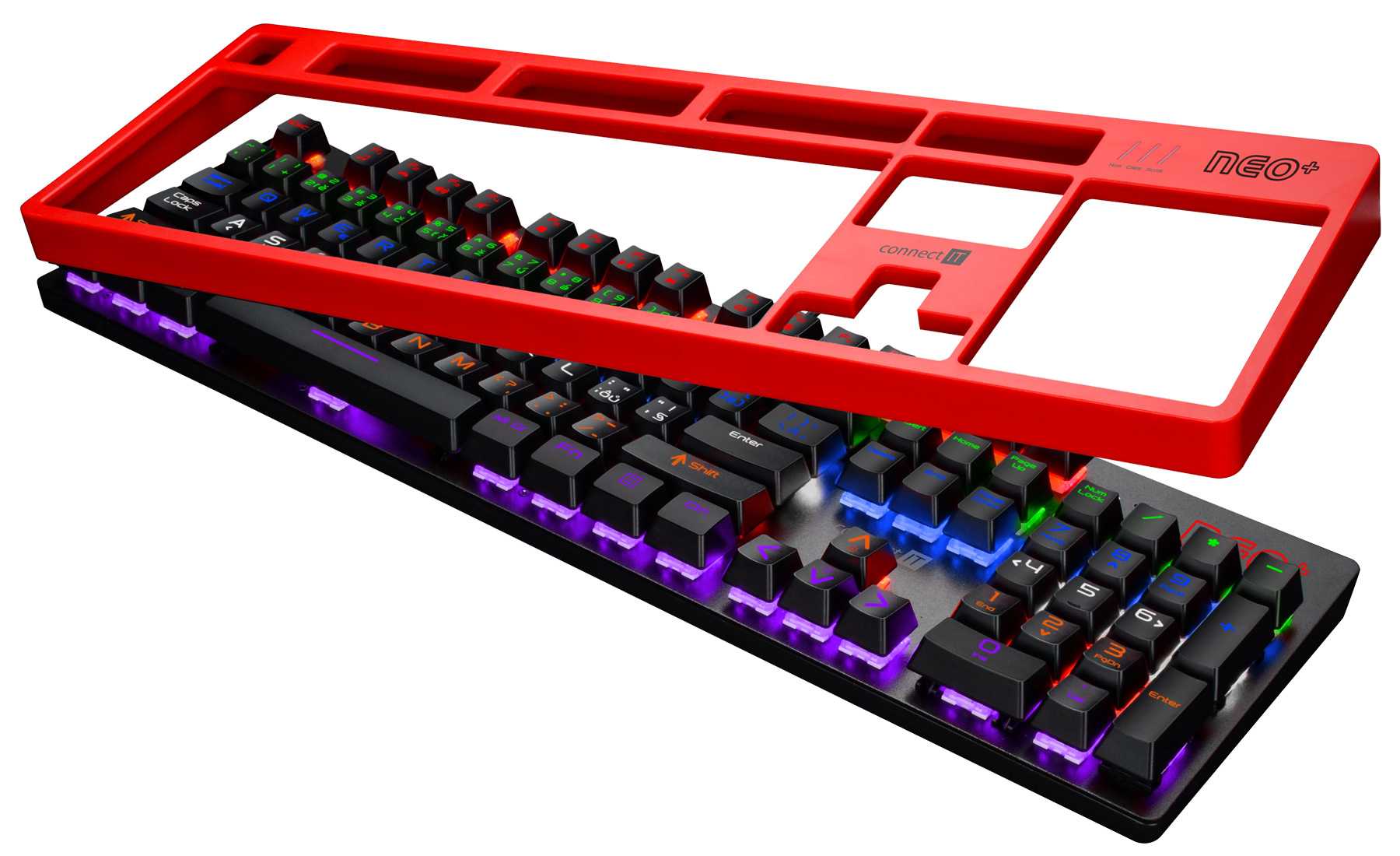 Kromě klasických herních funkcí, tato klávesnice disponuje mechanickými spínači s životností až 50 miliónů kliknutí. Další výhodou této klávesnice spočívá v její základně, vedou z ní totiž 3 drážky v různých směrech, díky kterým vám nebude překážet kabel od klávesnice. Balení obsahuje odnímatelný červený rámeček, který kompletně změní vzhled klávesnice. K této klávesnici je dodáván software ke stažení zcela zdarma na stránkách www.connectit-europe.com. Samozřejmostí je u této série prémiový oplet přívodního kabelu a pozlacený USB konektor. V balení také naleznete arch 7 promo samolepek "NEO".