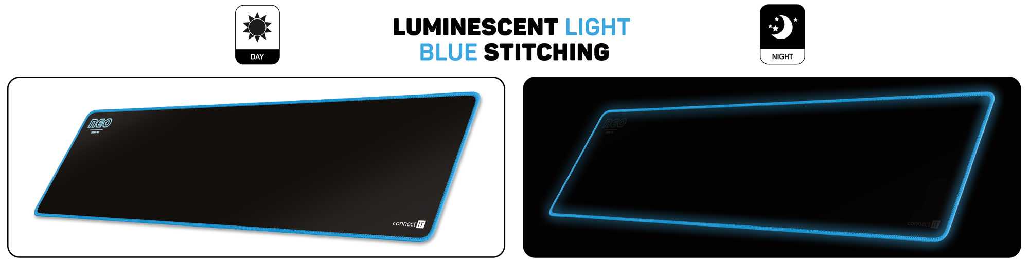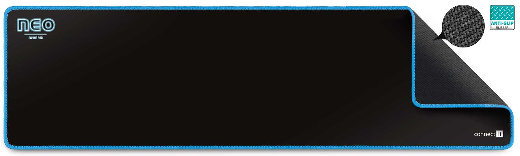 Profesionální podložka herní řady NEO určená i pro amatérské využití. Podložka má měkký, příjemný povrch. Při velikosti herní plochy 886 × 245 mm vám nikdy nedojde prostor k pohybu. Velkou výhodou je pogumovaná protiskluzová spodní strana a antistatický povrch, po kterém bez problému bude jezdit každá myš. Materiál byl navržen tak, aby odpuzoval vodu a nečistoty. Podložka má obšité okraje speciální kvalitní svítící nití, která ve tmě jemně svítí.