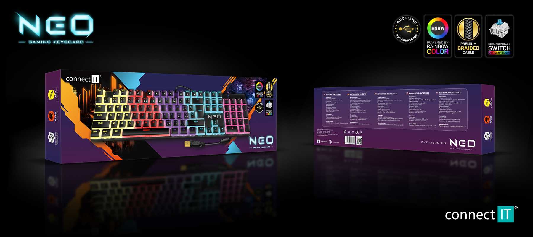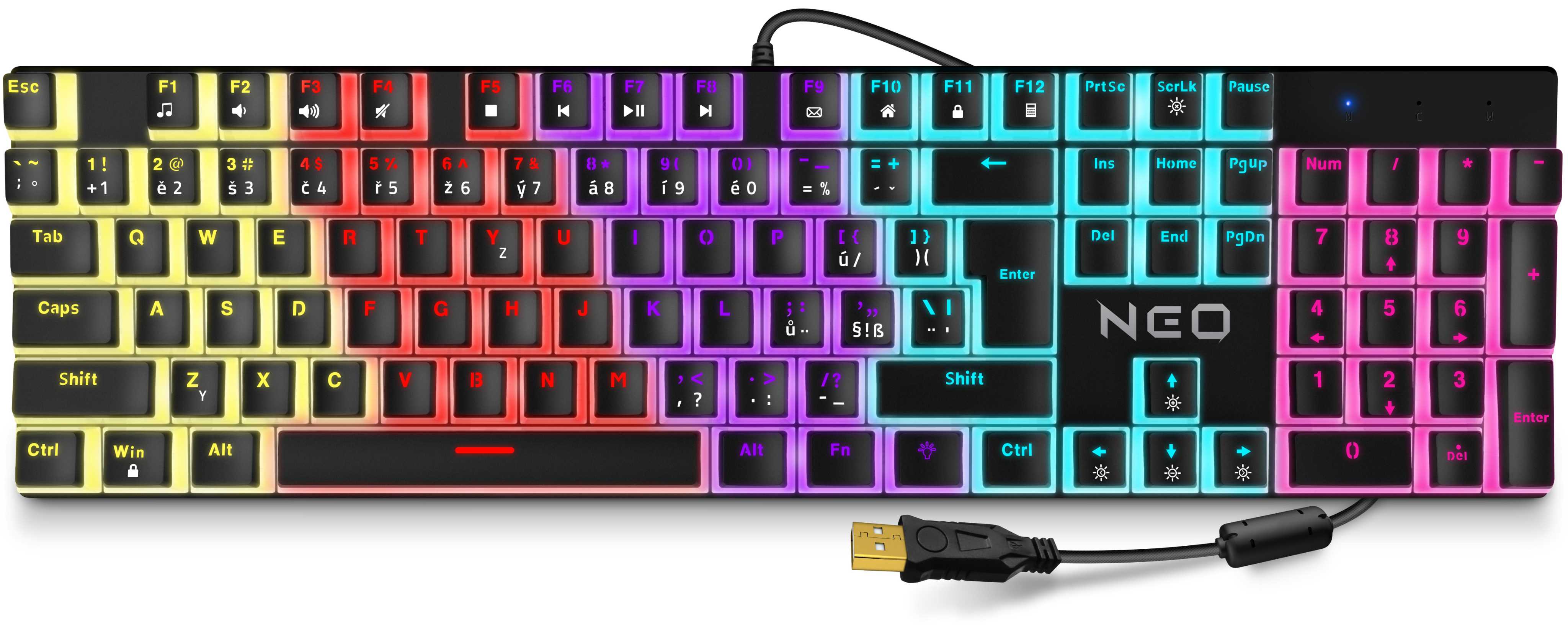 Profesionální mechanická klávesnice z řady NEO series pro hráče počítačových her v českém layoutu s celkem 12 módy barevného rainbow podsvícení a čtyřstupňovou regulací intenzity podsvícení. K dispozici je 12 multimediálních kláves.