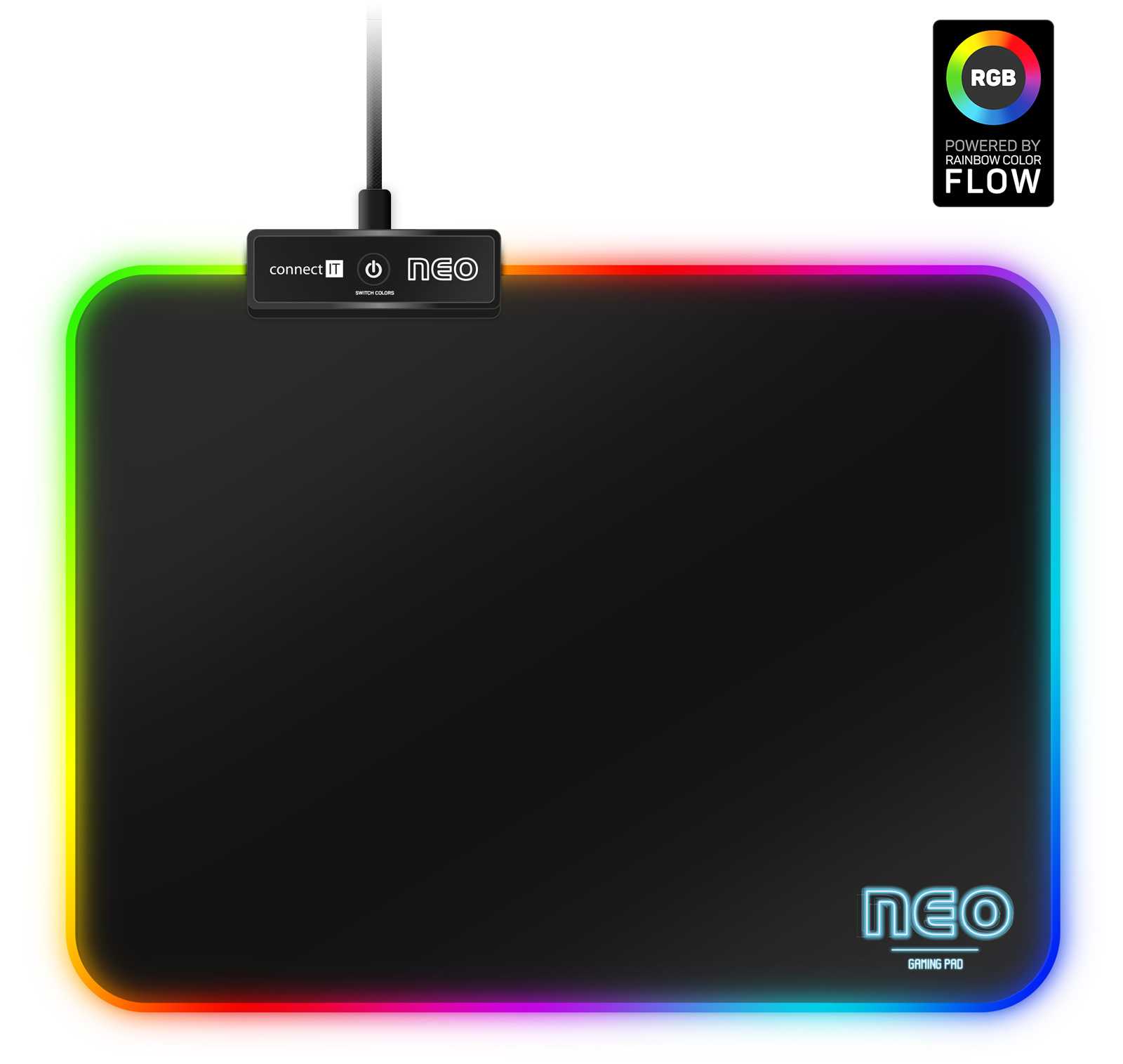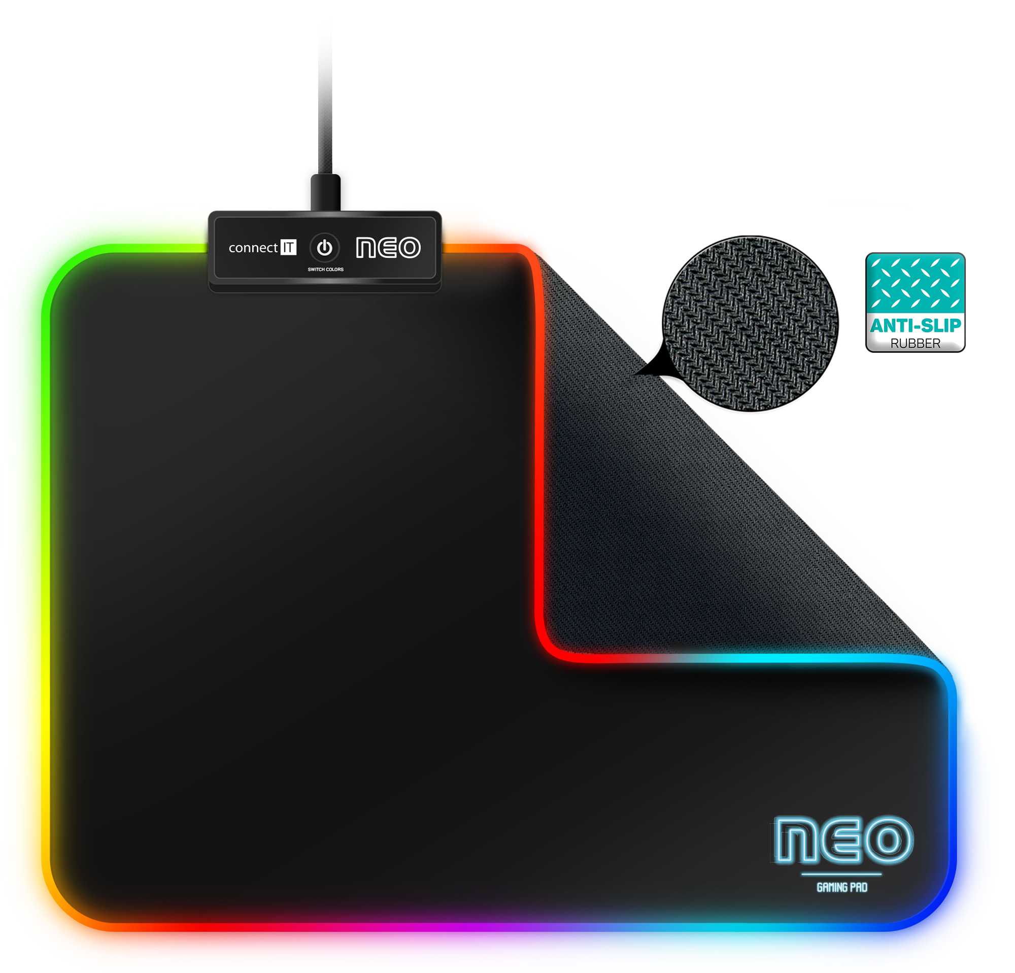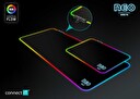 Profesionální podložka herní řady NEO určená i pro amatérské využití. Podložka má měkký, příjemný povrch. Při velikosti herní plochy 320 × 240 mm vám nikdy nedojde prostor k pohybu. Velkou výhodou je pogumovaná protiskluzová spodní strana a antistatický povrch, po kterém bez problému bude jezdit každá myš. Materiál byl navržen tak, aby odpuzoval vodu a nečistoty. Podložka má obšité okraje s RGB podsvícením. V levé části podložky je ovládací panel, díky kterému si můžete zvolit až z 11 barevných módů.