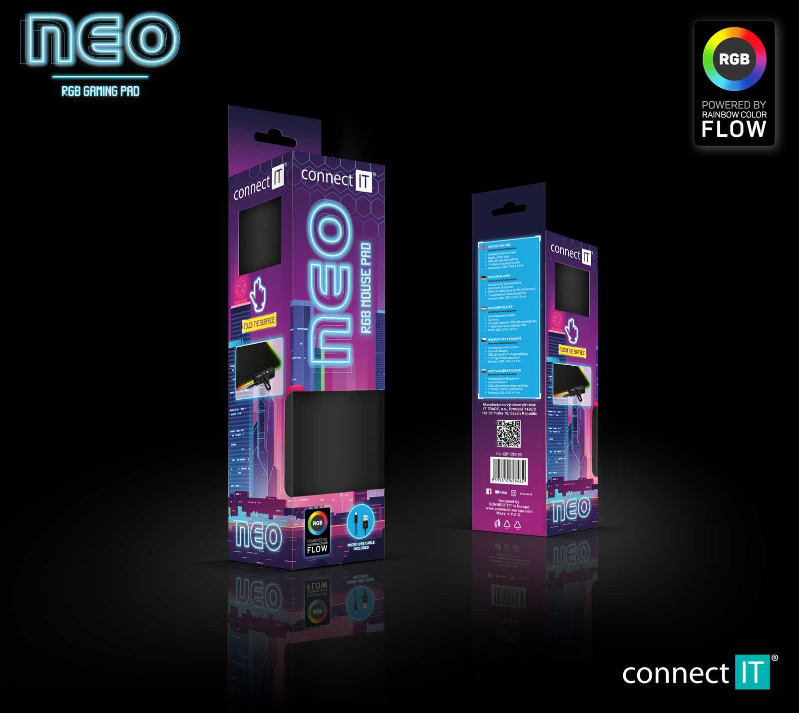Na kvalitní a stylové podložce CONNECT IT NEO se projeví pozitivní vlastnosti vaší myši. Moderní materiál, ze kterého je podložka vyrobena, poskytuje myši dobře snímatelný podklad i pro nejjemnější laserové snímání. Dvouvrstvý materiál kombinující protiskluznost na spodní straně a ideální vlastnosti pro myši na vrchní straně se výraznou měrou zaslouží o ideální poměr mezi kontrolou nad myší a skluzem. Napájení podložky zajistí opletený micro USB kabel, který je součástí balení. Nedílnou součástí této řady je také arch promo samolepek "CONNECT IT NEO"