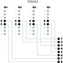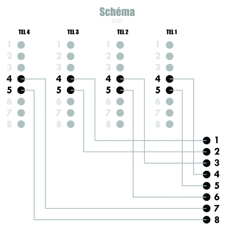 - adaptér pro sdružení 4 telefonních linek (2 žíly) do jednoho 4 párového kabelu - používá se v páru, nutno tedy zakoupit sudé množství Zapojení pinů: RJ45M: 1-2-3-4-5-6-7-8 RJ45F1: x-x-x-4-5-x-x-x RJ45F2: x-x-4-x-x-5-x-x RJ45F3: 4-5-x-x-x-x-x-x RJ45F4: x-x-x-x-x-x-4-5 Rozměry: - šířka 27 mm - výška 26 mm - délka těla: 85 mm - délka těla včetně kabelu 220mm