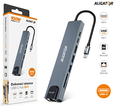 Aligator Dokovací stanice USB-C / Hub 8v1 (USB-C / 2xUSB / SD / MicroSD/ HDTV / RJ45)