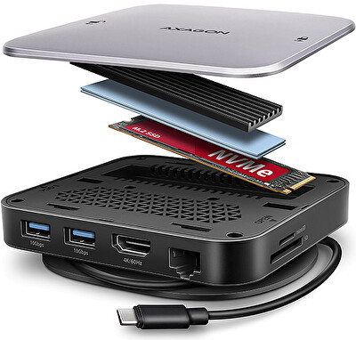 AXAGON HMC-UFO, USB 10Gbps hub, 2x USB-A, USB-C, HDMI 4k/60, RJ-45, M.2 slot, SD/mSD, audio, PD