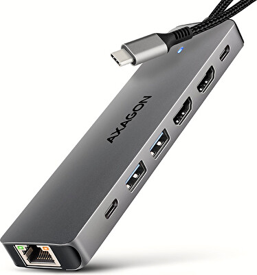 AXAGON HMC-7HX2, USB 5Gbps hub, 2x USB-A, USB-C, 2x HDMI 4k/60Hz, RJ-45 GLAN, PD 100W, kabel 15cm