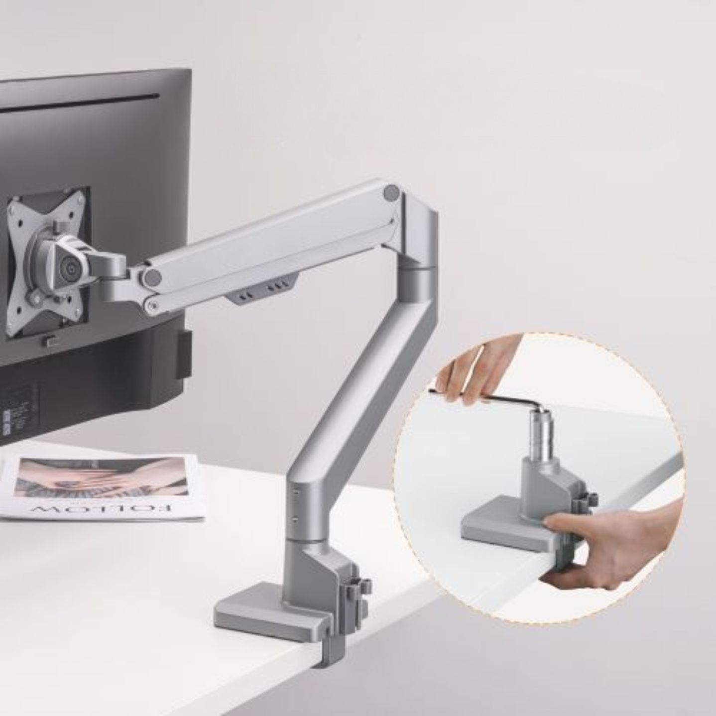 • Snadná instalace: Držák je dodávám s kompletním montážním příslušenstvím, díky němuž je možné ho snadno namontovat na stůl během několika minut. Snadná montáž pomocí svorky na desky o tloušťce 10-50 mm nebo pomocí průchodky na desky o tloušťce 10-45 mm.