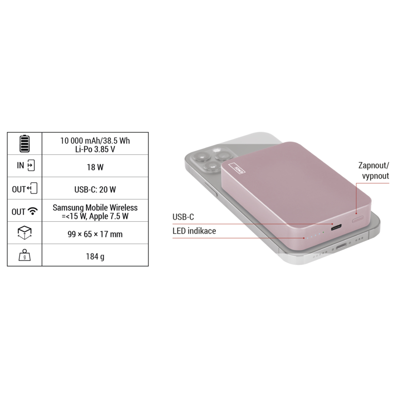 EMOS POWERBANKA WI1046, bezdrátové nabíjení 20W, 10.000mAh, LOSOSOVÁ, 1xUSB-C