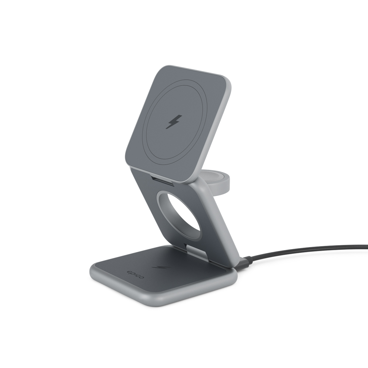 Epico Mag+ Foldable Wireless Charger je skvělou volbou pro uživatele Apple. Tato elegantní nabíječka je vyrobena z odolného hliníku a má silikonové detaily, které zabraňují sklouznutí zařízení. Skládací design je ideální pro snadné přenášení. Nabíječka má tři bezdrátové výstupy - 15W MagSafe kompatibilní výstup pro chytré telefony (7,5W pro iPhone), 3W výstup pro Apple Watch a 5W výstup pro AirPods. Celkový výkon nabíječky je až 22W a stav nabíjení můžete sledovat díky LED indikaci.