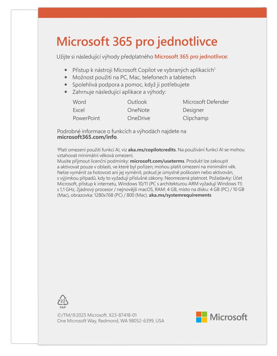 Microsoft 365 pro jednotlivce Microsoft 365 pro jednotlivce obsahuje 1 TB cloudového úložiště, pokročilé zabezpečení a inovativní aplikace využívající AI. *Pro jednu osobu *Možnost používání až na pěti zařízeních současně *Možnost používání na PC, Macu, iPhonu, iPadu a telefonech a tabletech s Androidem *1 TB (1000 GB) zabezpečeného cloudového úložiště *Kancelářské aplikace s Microsoft Copilotem *Designer pro vytváření a editování obrázků s využitím umělé inteligence *Videoeditor Clipchamp s prémiovými filtry a efekty *Pokročilé zabezpečení v programu Microsoft Defender pro vaše osobní údaje a zařízení *Antiransomwarová ochrana souborů a fotografií na OneDrivu *Průběžná podpora a pomoc, kdykoli ji potřebujete Pro používání Copilota a vytváření obrázků pomocí AI platí určitá omezení. Dostupnost aplikací se liší podle zařízení a jazyka. Funkce se liší podle platformy a oblasti. Produkty Microsoft 365 jsou vázány na oblast, kde byly zakoupeny.