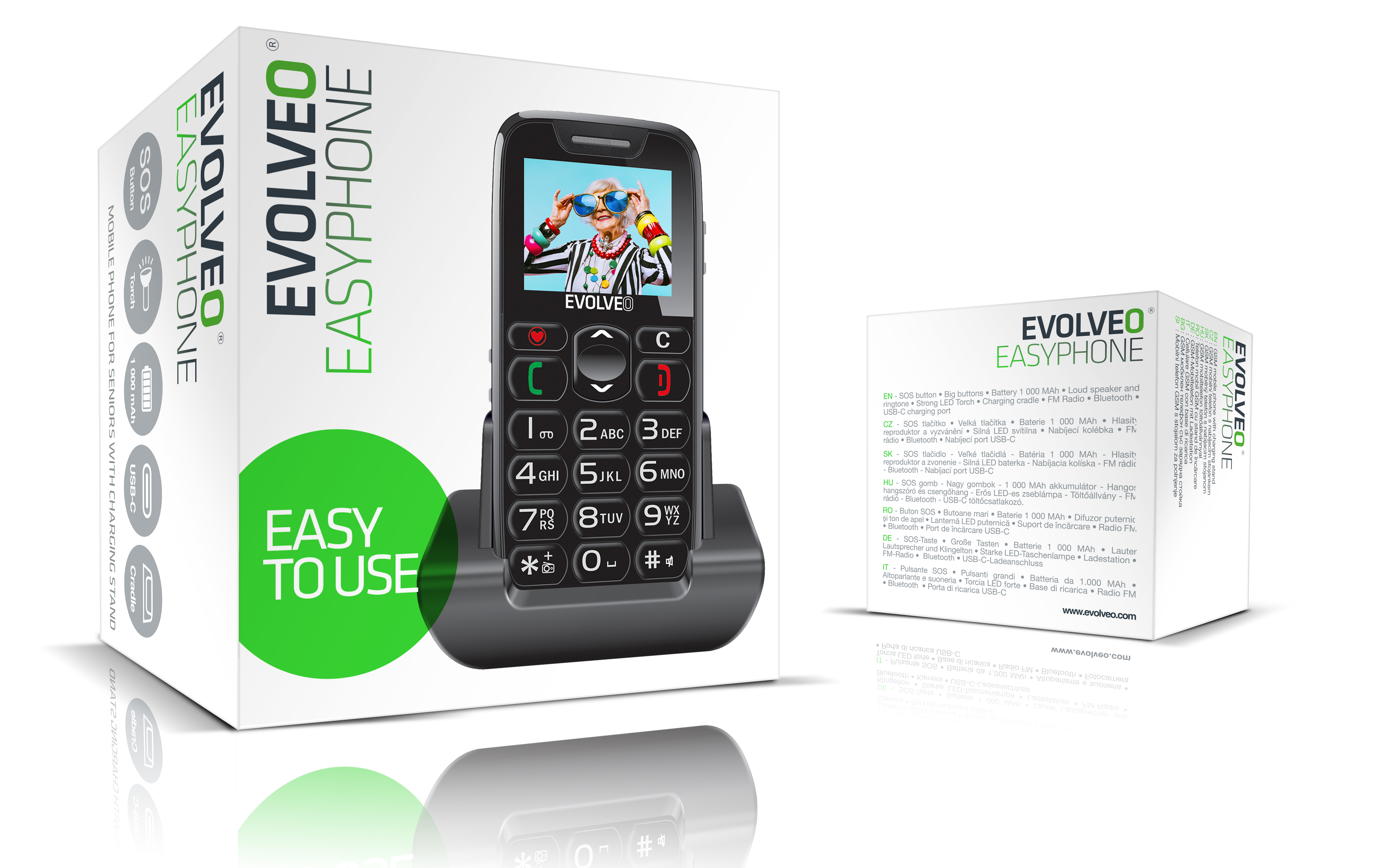 Telefon je dodáván s praktickým nabíjecím stojánkem, který zjednodušuje nabíjení baterie. Stačí telefon zasunout do stojánku a nabíjení se spustí automaticky, což ušetří čas a usnadní každodenní používání telefonu. Kapacita 1000 mAh Li-Ion baterie a výdrž až 8 dní zajistí, že telefon EVOLVEO EasyPhone nezradí, když ho nejvíce potřebujete.