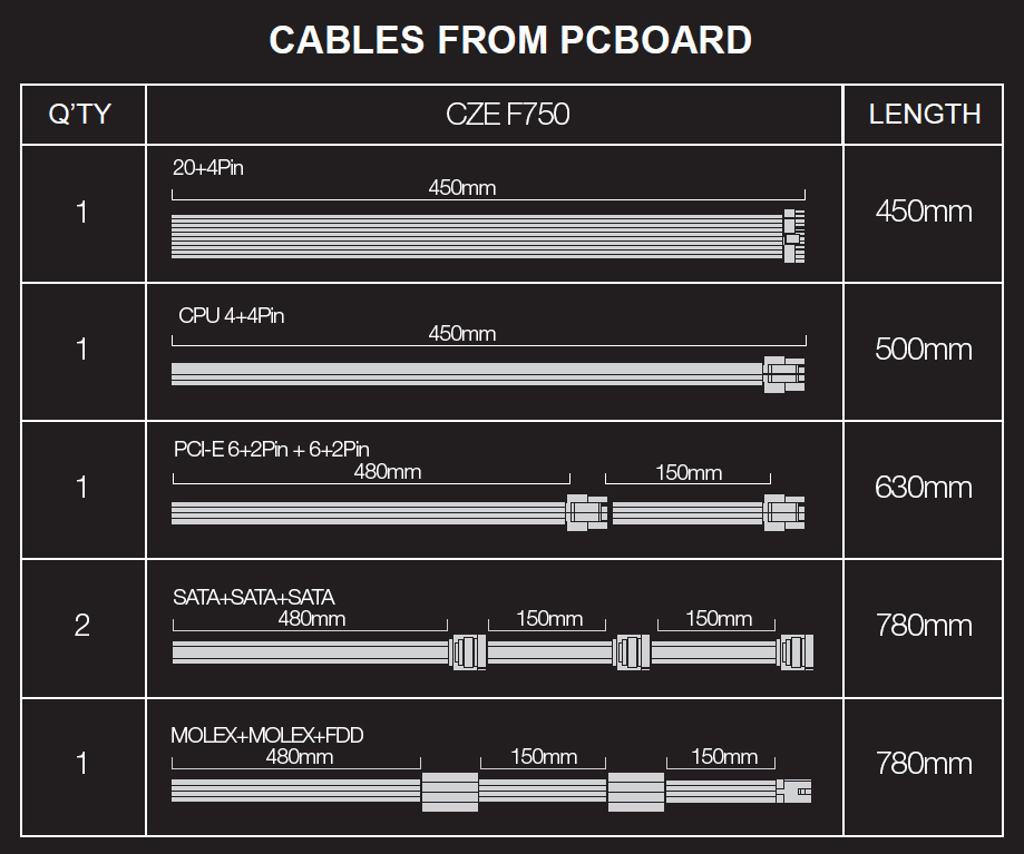 Specifikace • Ventilátor 14 cm, zelený • Aktivní PFC • Certifikace 80+ bronze • Účinnost minimálně 82%/85%/82% při zátížení 20%/50%/100% • Ochrana proti zkratu, přetížení, přepětí, podpětí a tepelná ochrana • semi-pasivní chlazení do 20% zatížení Semipasivní chlazení, ventilátor zdroje je obvykle neaktivní a spustí se pouze při překročení 20% hranice výkonu zdroje. Kabeláž • 20+4 Pin (450mm) • CPU 4+4 pin (450mm) • PCI-E (6+2) +(6+2)pin (450+150mm) • Sata+Sata+Sata (450+150+150mm) • Sata+Sata+Sata (450+150+150mm) • Molex+Molex+FDD (450+150+150mm) • černá barva