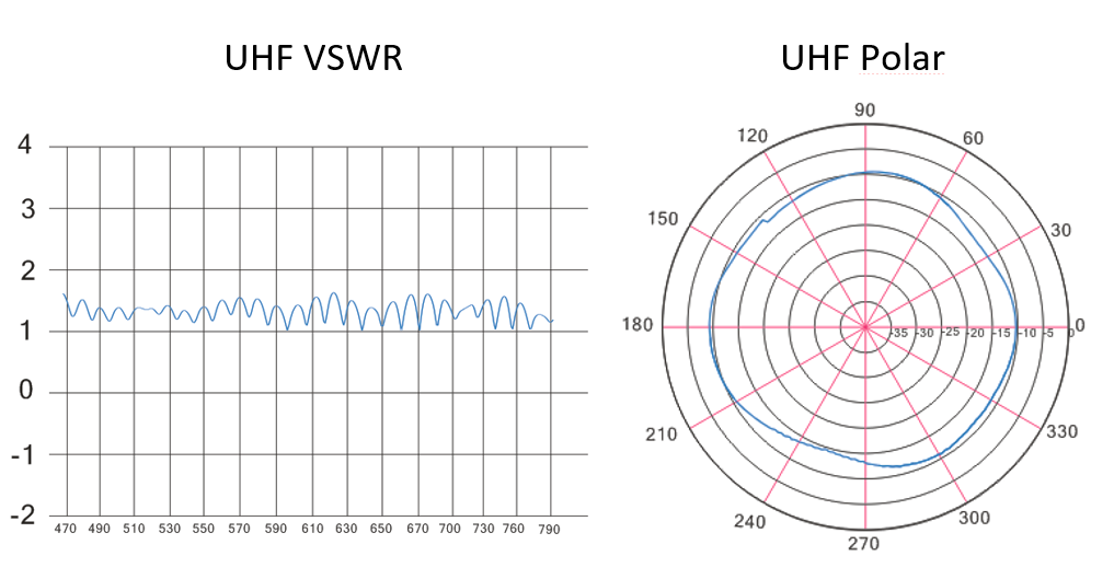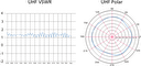 UHF VSWR graf zobrazuje účinnost antény v pásmu UHF. Koeficient rovný 1 znamená přeměnu všech elektromagnetických vln na elektrický signál. S grafem UHF Polar je možné pozorovat oblasti prostoru antény s nejlepším ziskem. Anténa Jade 3 je všesměrová, znamená to tedy možný příjem ve všech směrech.