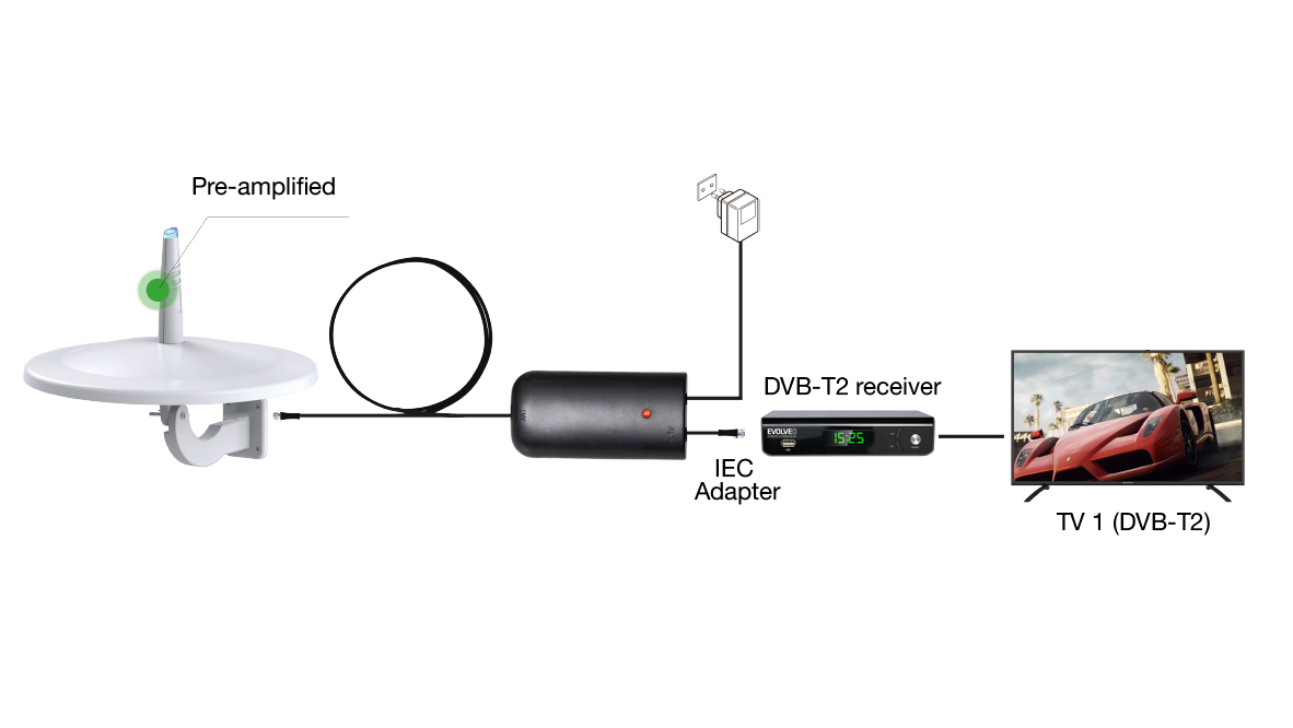 S anténou je možný příjem signálu 360° ve vertikálním směru a 360° v horizontálním směru. Díky tomu může anténa přijímat signál ze všech typů pozemních vysílačů vysílajících DVB-T2 signál.