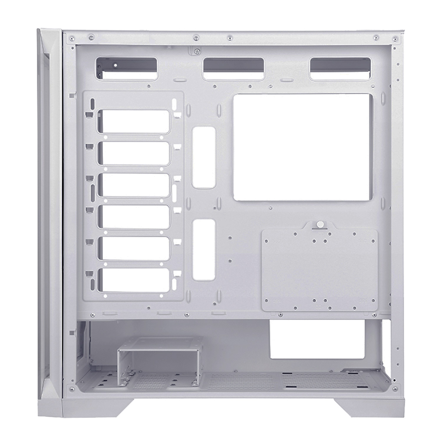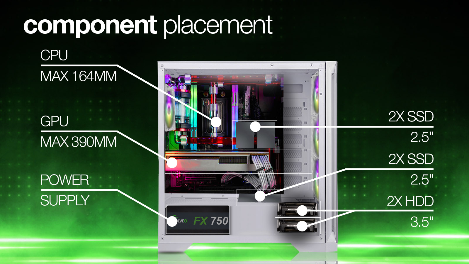 Vnitřní prostor této herní počítačové skříně je navržen tak velkoryse, že může být základem i pro ty nejambicióznější počítačové sestavy. Chladič procesoru může měřit až 164 mm na výšku. Grafická karta se sem vejde v délce až 390 mm. A pro ukládání dat je k dispozici místo pro 2 klasické pevné disky (3,5") a 3 moderní rychlá SSD úložiště (2,5"). Každá hardwarová součástka je zkrátka v této digitální pevnosti vítaným hostem a dostane se jí péče jako na císařském dvoře. Roli přitom nehraje ani její urozený původ – do skříně se dají vložit základní desky Intel i AMD, přičemž jsou podporovány formáty ATX, eATX (Extended ATX), mATX (Micro ATX) i mITX (mini ITX).