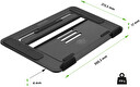 • Univerzální konstrukce pro notebooky a tablety až do 16" • Pasivní systém chlazení s efektivním odvodem tepla a optimalizovanou cirkulací vzduchu • Extra velký chladicí otvor 22 × 16,1 cm • Výškově polohovatelný do 3 úhlů (22°/30°/40°) • Ultralehká konstrukce z odlehčeného leteckého hliníku (hmotnost pouhých 499 g) 1) Garantuje torzní stabilitu 2) 100% odolná proti korozi 3) Dlouhá životnost • Skládací konstrukce ideální pro jednoduchý a komfortní přenos • Silikonové opěrky pro spodní hranu notebooku (šířka 4,6 cm) zabraňují: 1) Poškrábání notebooku 2) Nechtěnému sklouznutí při manipulaci 3) Pohybu notebooku při psaní • Silikonové postranní bloky eliminující poškrábání spodní části notebooku • Protiskluzové silikonové patky výklopné části pro maximální stabilitu na stole • Ultraslim provedení (výška ve složeném stavu pouhé 4 mm bez opěrek) • Ergonomicky polohovatelná konstrukce garantuje: 1) Správně držení těla 2) Zmírnění bolesti zad a očí • Systém chlazení DoubleFlow přes dva ultravelké chladící otvory zajišťuje: 1) Vynikající cirkulaci vzduchu 2) Odvod tepla 3) Stabilní teplotu notebooku • Materiál: hliník + silikon • Tloušťka hliníku: 3,75 mm • Nosnost: 10 kg • Výška včetně zarážek: 17 mm • Rozměry (š × h × v): 300,5 × 213,5 × 4 mm • Hmotnost: 499 g