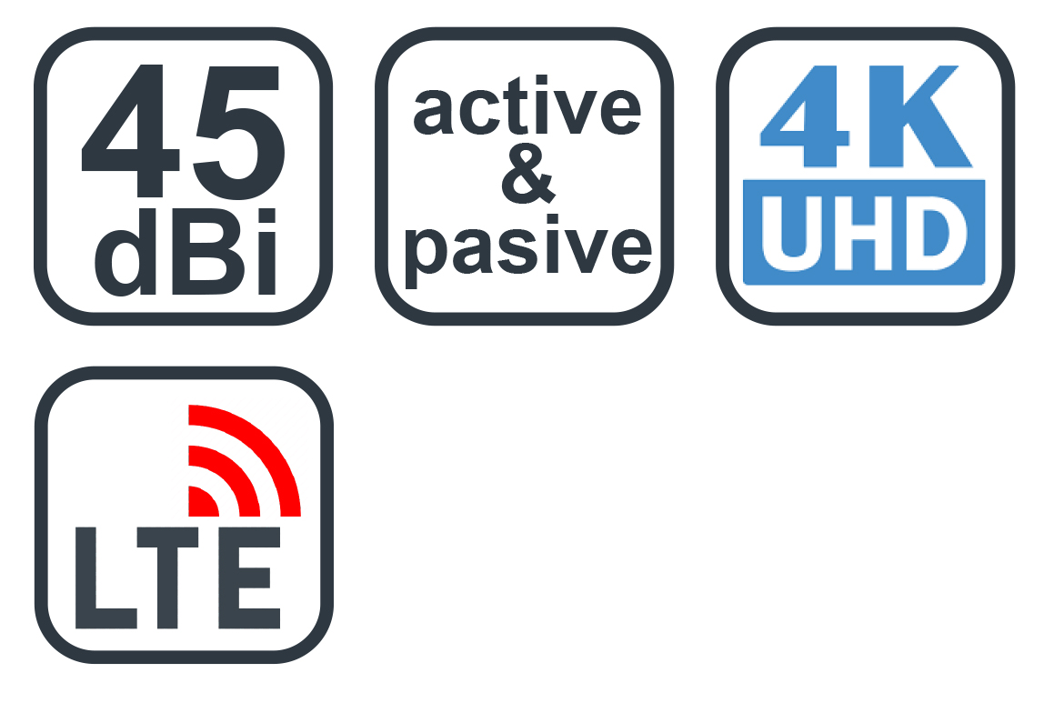 • zisk: 45 dBi • filtr LTE, 4G, 5G • VHF: 87,5-230MHz (FM/DAB+) • UHF: 470-694 MHz (DVB-T2) • napájení AV 220-240V, DC 5V/50mA • konektor IEC male • velikost: 330 x 230 x 2 mm