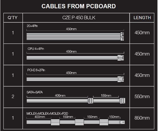 Specifikace • CE certifikace, norma RoHs • tichý 12 cm větrák s regulací otáček • kabeláž v délce 40 cm • 1x napájecí kabel pro MB 20+4pin • 1x napájecí kabel s 3x MOLEX konektorem a 1x fd3 • 1x napájecí kabel cpu 4pin (8pin - 4+4) • 2x napájecí kabel s 2x S-ATA konektorem • 1x napájecí kabel VGA PCI-E 6+2pin