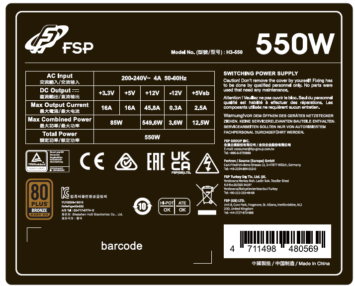 FSP HYPER 80+ PRO 550, 80PLUS BR.230V, ATX3.0,bulk