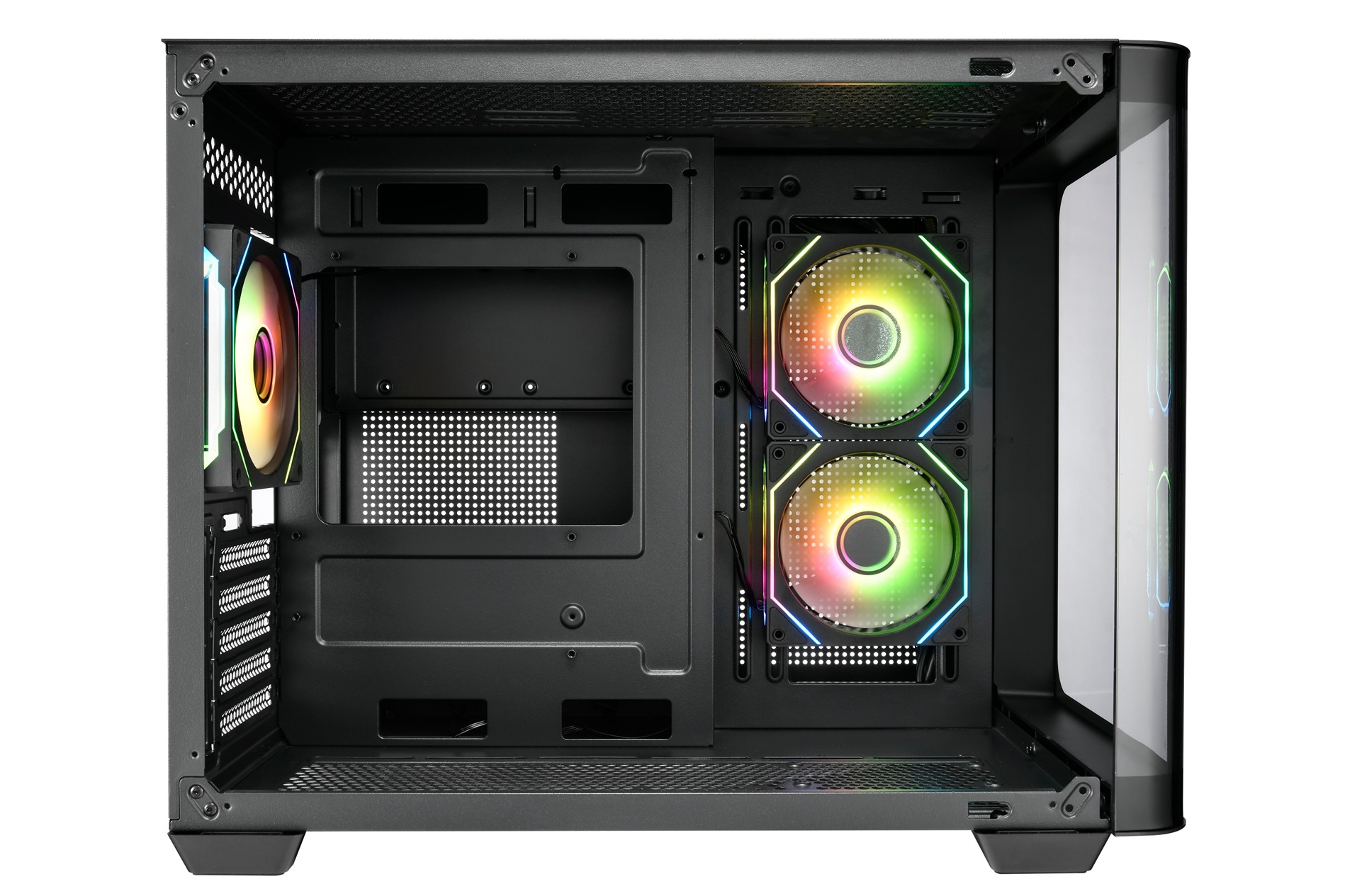 FSP S380-BA * 3D zakřivený boční panel - 0,7 mm SPCC * chladič až 360 mm * grafická karta až 445 mm Typ: M-ATX Mid Tower Podporuje základní desky: Micro ATX, Mini-ITX Pole pro disková úložiště: * 2+1 2,5" SSD * 2 3,5" HDD Počet rozšiřujících slotů: 5 Externí porty: * 2x USB 3.0 * 1x USB typ-C 3.2 * 2x 3,5mm jack Podpora pro přídavné chlazení Ventilátory a vodní chladič: až 9x 120mm * boční: 2x 120mm/140mm nebo 280mm * horní: 3x 120mm/2x 140mm nebo 360mm * zadní: 1x 120mm * spodní: 3x 120mm/2x 140mm Předinstalované ventilátory: * boční: 2x 120mm reverzní ARGB * zadní: 1x 120mm PWM ARGB Maximální výška chladiče CPU: 160mm Délka VGA karty: 445mm Velikost zdroje napájení: 240mm ATX Barva: černá Rozměry: 368x285x460mm Hmotnost: 6,4kg Záruka: 2 roky Více informací naleznete na stránkách výrobce: https://www.fsplifestyle.com/en/product/S380.html