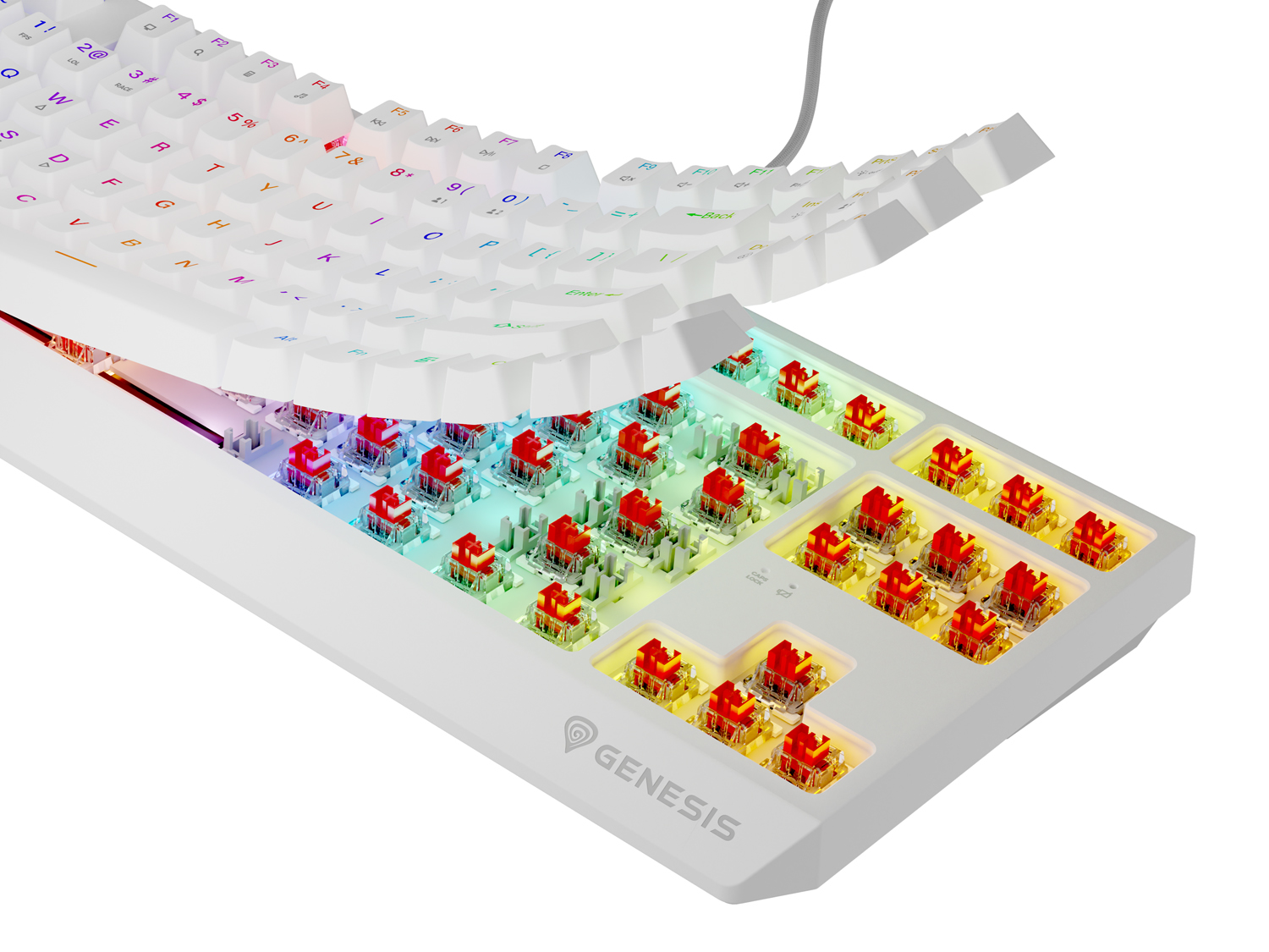 Klávesnici Genesis Thor 230 TKL jsme vybavili lineárními spínači Outemu Red, které vynikají vysokou přesností, aktivací bez ohledu na místo stisknutí klávesy a vysokou dynamikou. Víme však, že jako hráč můžete mít své vlastní preference. Proto jsme do Genesis Thor 230 TKL implementovali Hot Swap - techniku, která vám umožní nahradit jakýkoli třípinový mechanismus mikrospínačem od společností jako Outemu, Akko, KTT. Jednoduše vytáhněte nainstalovaný mechanismus a zapojte nový. Díky systému Hot Swap také nemusíte kupovat novou klávesnici, když jeden spínač selže. Vyměníte jej během několika sekund. Je to jednoduché.