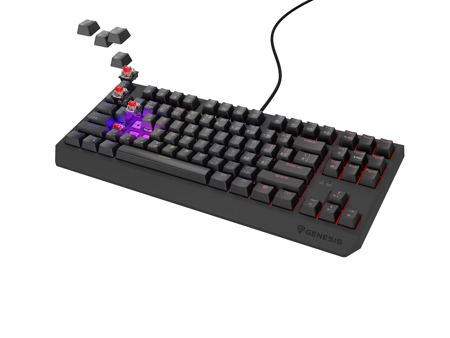 Klávesnici Genesis Thor 230 TKL jsme vybavili lineárními spínači Outemu Red, které vynikají vysokou přesností, aktivací bez ohledu na místo stisknutí klávesy a vysokou dynamikou. Víme však, že jako hráč můžete mít své vlastní preference. Proto jsme do Genesis Thor 230 TKL implementovali Hot Swap - techniku, která vám umožní nahradit jakýkoli třípinový mechanismus mikrospínačem od společností jako Outemu, Akko, KTT. Jednoduše vytáhněte nainstalovaný mechanismus a zapojte nový. Díky systému Hot Swap také nemusíte kupovat novou klávesnici, když jeden spínač selže. Vyměníte jej během několika sekund. Je to tak jednoduché.