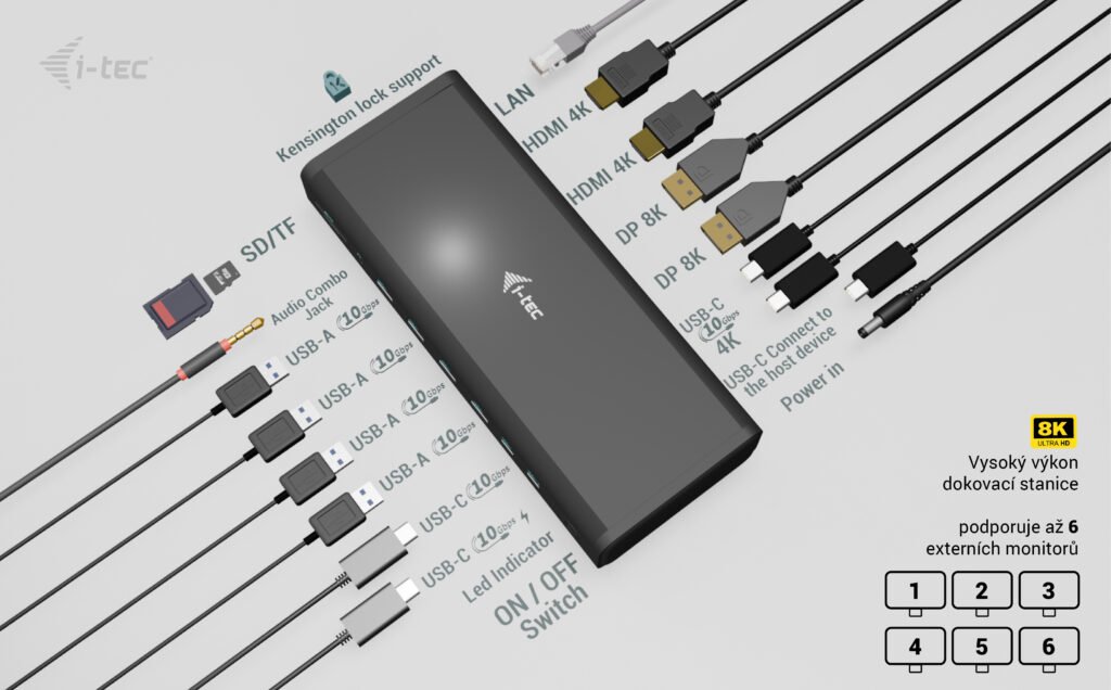 Dokovací stanice s nejvyšším možným výkonem! Podporuje až šest externích monitorů* s rozlišením 4K/60 Hz. Nebo dva mohou běžet současně i v rozlišení 8K! Ideální produkt pro uživatele, kteří vyžadují více monitorů, aniž by museli dělat kompromisy v oblasti stability obrazu, rozlišení a obnovovací frekvence. Dokovací stanice je také vybavena portem pro rychlé nabíjení USB-C (s nabíjecím výkonem až 30 W), zejména pro nabíjení smartphonů a tabletů, rychlými porty USB, portem LAN 2,5 Gbps, jakož i dalšími periferiemi.