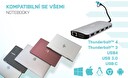 • Vysoce výkonná cestovní dokovací stanice až pro tři monitory současně • Dokovací stanice je kompatibilní s téměř jakýmkoli současným notebookem (připojení přes porty USB 3.0, USB-C, USB4 nebo Thunderbolt™ 3/4). • Port HDMI 1 podporuje vysoké rozlišení až 4K • Nativní podpora portu VGA pro starší displeje nebo projektory • 5x portů USB (1x USB-C, 1x USB 3.2 a 3x USB 2.0) umožňuje snadné připojení zařízení a periferií USB • Sloty SD/microSD pro snadný přenos dat z paměťových karet • GLAN Ethernet podporuje síťové rychlosti 10/100/1000 Mb/s a poskytuje robustní a vysokorychlostní připojení k internetu. • Dokovací stanice podporuje až 100W napájení připojeného notebooku nebo tabletu Popis Výkonná, přesto však malá a přenosná dokovací stanice, která podporuje výstup až na tři externí monitory. Dok lze použít prakticky s jakýmkoliv notebookem, neboť podporuje připojení ke všem obvyklým portům: USB 3.0, USB-C, USB4 a Thunderbolt“ 3/4, a zároveň podporuje všechny běžné současné operační systémy. Připojení ke třem monitorům však bude možné pouze v případě notebooku s portem Thunderbolt“ 3/4, případně USB-C portem podporujícím přenos videa (tzv. USB-C DP Alt mode). 5 USB portů, spolehlivé a rychlé připojení do podnikové sítě díky integrovanému LAN portu a nativní podpora VGA, to vše z této dokovací stanice dělá ideálního společníka pro profesionály, kteří jsou na často na cestách a potřebují připojení i ke starším monitorům a projektorům. Samozřejmostí je podpora nabíjení vašeho notebooku či tabletu (a to až 100W). • Připojte až 3 externí monitory* • Power delivery: až 100 W • K dispozici jsou 2 porty HDMI* a jeden VGA port • 1x USB 3.2, 1x USB-C a 3x USB 2.0 vám umožní snadné připojení vašich USB zařízení a • Gigabitový Ethernet RJ-45 poskytuje spolehlivé, robustní a vysokorychlostní internetové připojení s podporou 10/100/1000 Mbps rychlostí • Sloty SD a microSD pro snadné přenášení dat z paměťových karet • Podporuje Windows 10/11, macOS, Android, Linux a ChromeOS * Port HDMI 1 bude fungovat pouze v případě připojení k notebooku s portem ThunderboltTM 3/4, USB4, případně USB-C portem podporujícím přenos videa (tzv. USB-C DP Alt mode) V případě, že je dokovací stanice připojena přes USB 3.0, nabíjení notebooků a tabletů nepodporuje Specifikace • Integrovaný 30 cm kabel USB-C obsahuje adaptér USB-C na USB 3.0 • Power Delivery: 100 W • Video Porty: - 2x HDMI* - 1x VGA • Rozlišení: - 1 monitor – 1x HDMI 1 až 4K/30Hz - 1 monitor – 1x HDMI 2 až 1080p/60Hz - 1 monitor – 1x VGA až 1080p/60Hz - 2 monitory – HDMI 1 + HDMI 2 až 4K/30Hz + 1080p/60Hz - 2 monitory – HDMI 1 + VGA až 4K/60Hz + 1080p/60Hz - 2 monitory – HDMI 2 + VGA až 2x 1080p/60Hz - 3 monitory – HDMI 1 + HDMI 2 + VGA až 4K/30Hz a 2x 1080p/60Hz • 1x USB-C 3.2 port Gen. 1 (pouze pro data) • 1x USB-C PD port (power delivery only) • 1x USB-A 3.2 port Gen. 1 • 3x USB-A 2.0 • 1x SD slot • 1x microSD slot • 1x Ethernet GLAN RJ-45 port (DL 3900) • LED indikace • OS: Windows 10/11, macOS, Linux, Android, ChromeOS s nejnovějšími aktualizacemi • Jednoduchá instalace ovladačů (Windows, macOS, Ubuntu, Android) • Rozměry produktu: 127 x 60 x 18 mm • Hmotnost produktu: 122g • Rozměry balení: 190 x 98 x 23 mm • Hmotnost balení: 140g Hardwarové požadavky: • Zařízení s volným USB-A, USB-C, USB4 nebo Thunderbolt™ 3/4 portem Požadavky pro funkci Power Delivery: • Zařízení s volným USB-C, USB4 nebo Thunderbolt™ 3 portem s podporou „Power Delivery“ Požadavky pro video výstup z portu HDMI 1: • Zařízení s volným USB4, USB-C portem s podporou “DisplayPort Alternate Mode” nebo Thunderbolt™ 3/4 portem Operační systém: • OS: Windows 10/11, macOS, Linux, Android, ChromeOS s nejnovějšími aktualizacemi * Port HDMI 1 bude fungovat pouze v případě připojení k notebooku s portem ThunderboltTM 3/4, USB4, případně USB-C portem podporujícím přenos videa (tzv. USB-C DP Alt mode) Obsah balení • Produkt • Manuál