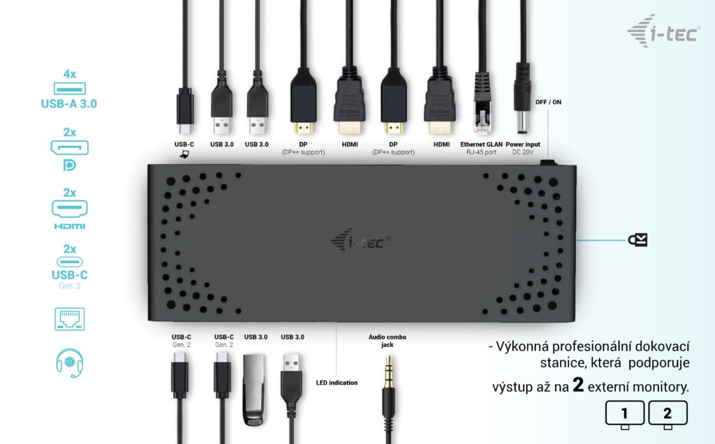 Výkonná kancelářská dokovací stanice s podporou superrychlých portů USB Gen 2. Dokovací stanice podporuje výstup až na dva externí monitory ve vysokém rozlišení až 4K. Dokovací stanici lze použít prakticky se všemi notebooky, protože podporuje připojení ke všem běžným portům: 3.0, USB-C a Thunderbolt“ 3/4 a zároveň podporuje všechny běžné současné operační systémy.