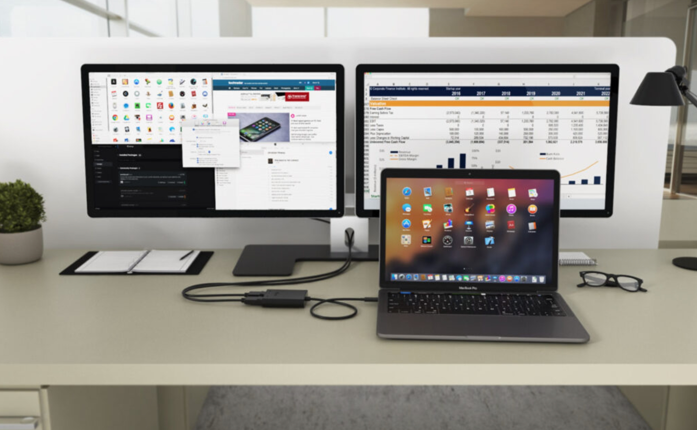 • Výkonný videoadaptér USB-C, ke kterému lze připojit až dva monitory současně