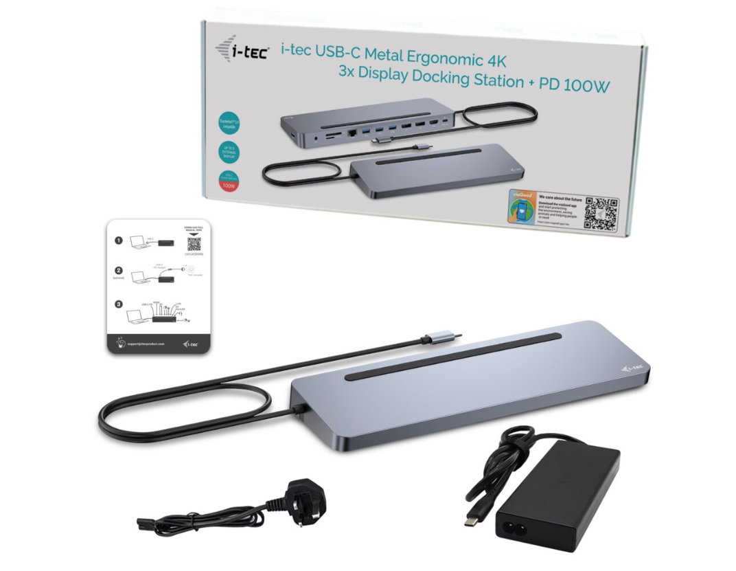 Ergonomická kovová dokovací stanice USB-C s podporou až 3 externích monitorů. Stanice je kompatibilní s jakýmkoli notebookem vybaveným portem USB-C nebo Thunderbolt (60 cm dlouhý integrovaný kabel je dostatečně dlouhý pro připojení všech notebooků s obrazovkami do velikosti 15”). Dokovací stanice poskytuje 4 porty USB, spolehlivé a rychlé připojení k firemním sítím díky integrovanému portu LAN a napájení až 100 W. Konstrukce stanice umožňuje také její použití jako stojanu pro notebook.