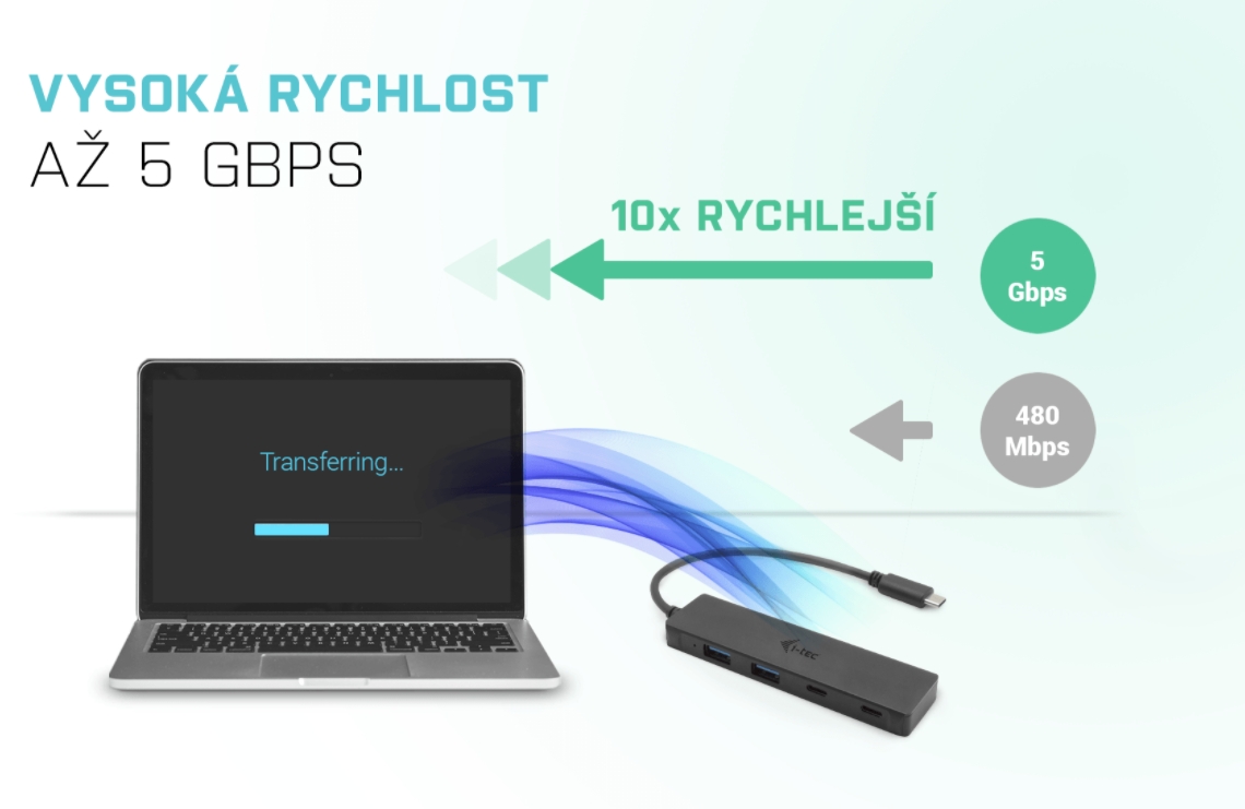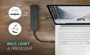 USB-C a Thunderbolt” 3 či 4 jsou na dnešních noteboocích a tabletech čím dál populárnější. Společně s jejich čím dál širším využívání ubývá na těle notebooků množství USB portů. A pokud potřebujete připojit ke svému zařízení příslušenství, na které již nemáte dostatek portů, můžete využít tohoto malého, ale šikovného rozbočovače. S tímto hubem získáte další 4 další USB: dva standardní USB 3.0, a dva USB-C porty. Připojte si externí klávesnici a myš, přenášejte data nebo filmy z USB flash disku rychlostí až 5 Gbps nebo nabíjejte svá mobilní zařízení nabíjejte (standardní USB rychlostí 0.9A). Hub nevyžaduje instalaci ovladačů, pouze jej pomocí USB-C kabelu připojíte a můžete jej ihned začít využívat. Hub má vestavěnou přepěťovou ochranu vašeho počítače pro případ zkratu na periferních zařízeních. Samozřejmostí je zpětná kompatibilita s USB 2.0. Díky kompaktním rozměrům a nízké hmotnosti jej můžete mít v brašně stále sebou – kovový povrch ostatně chrání hub před poškozením a před poškrábáním. Specifikace • 1x integrovaný USB-C kabel pro připojení k zařízení (19 cm) • 2x USB-C port gen. 1 (pouze data) • 2x USB 3.0 port • LED indikace • Přepěťová a proudová ochrana • OS: Windows 7 / 8 / 8.1 /10, macOS X, Linux, Android, Chrome OS • Rozměry produktu: 110 x 30 x 11 mm • Hmotnost produktu: 42 g • Rozměry balení: 155 x 100 x 20 mm • Hmotnost balení: 123 g Hardwarové požadavky: • Zařízení s volným USB-C nebo Thunderbolt™3/4 portem Operační systém: • Windows 7 / 8 / 8.1 /10, macOS X, Linux, Android, Chrome OS Obsah balení • Produkt • Manuál